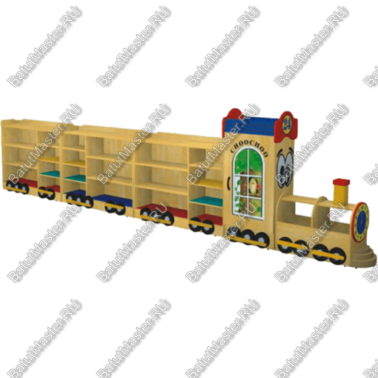 Шкаф действительно довольно точно напоминает паровозик, к которому прикреплены вагончики. Он имеет 6 секций разного размера и разного количества горизонтальных полочек. Но габаритные размеры совсем не внушительные. При высоте 1100 мм шкаф имеет глубину полочек 350 мм, а общая ширина шкафа в пределах 700 мм. Изделие изготовлено из древесно-стружечных плит высокого качества. Последующая шлифовка устраняет все шероховатости. Поверхность полок и их торцевые части покрашены защитной краской, которая позволяет сохранять материал от воздействия воды. Такая защита позволяет проводить регулярную санитарную обработку водным раствором моющих средств.