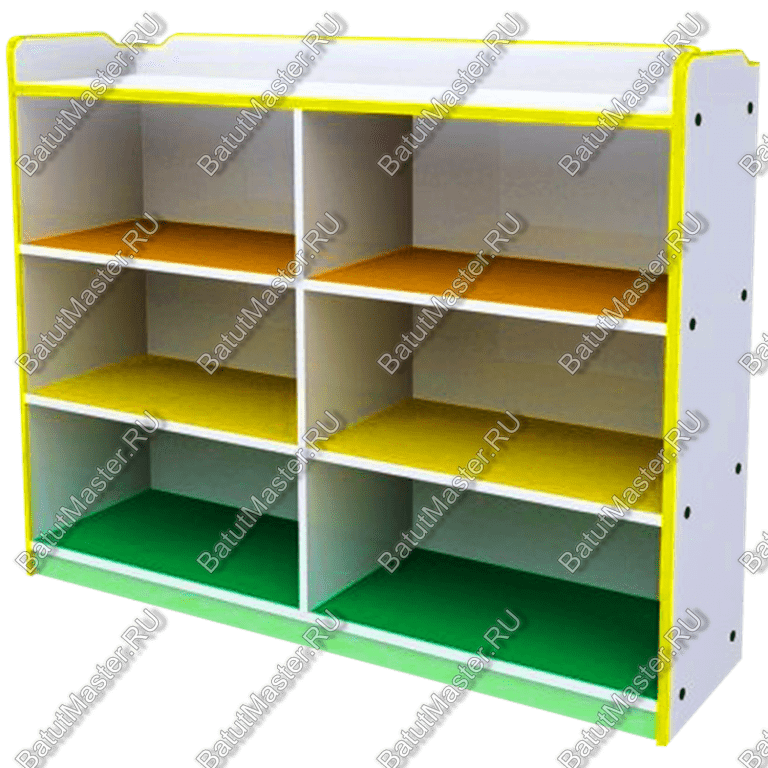 Шкаф разбит на две секции центральной вертикальной перегородкой. Каждая секция состоит из трех полочек. Общая высота 1200 мм, а это значит что высота одной полочки около 400 мм, что вполне достаточно для размещения и канцелярских принадлежностей, и игрушек. Здесь же можно складывать коробки с карандашами, фломастерами, пластилином. На таких полках легко разместятся дневные поделки воспитанников детского сада. Площадь в основании изделия составляет 300 мм на 800 мм. Шкаф легко может украсить стену группы в подвешенном состоянии, если крепеж будет обладать достаточной надежностью.