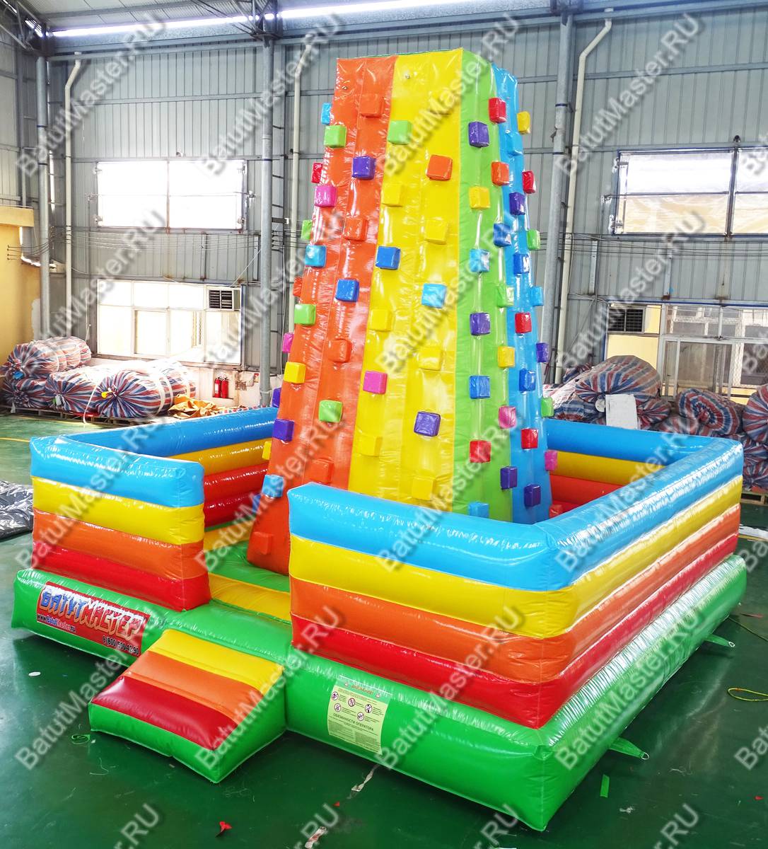Надувной скалодром для бизнеса выполнен в самых ярких тонах. Любимые цвета имеются и на самой имитированной горке, а удобные щиты позволят без затруднений карабкаться на самую вершину. По всему периметру установлены воздушные бортики, чтобы в случае падения дети не выпали наружу.