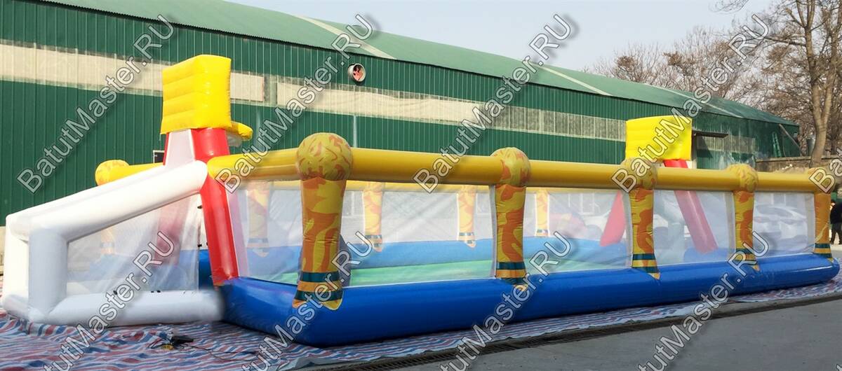 Надувной поле выполнено в ярких цветах, по всему периметру окруженная надувными столбиками с прочной сеткой. Таким образом дети всегда будут на виду и на площадке хорошо будет циркулировать воздух.