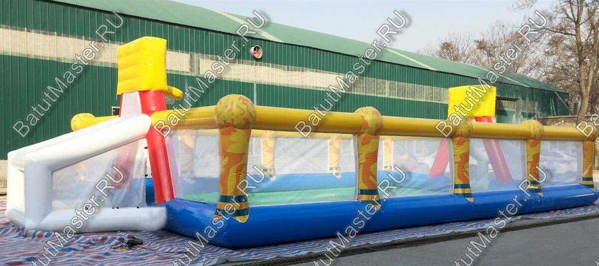 Коммерческое спортивное поле для бизнеса – это полезная, универсальная конструкция, при этом мягкая и воздушная. Она необходима для выполнения различных трюков, тренировок, а также подвижных игр в мяч и т.д. Основа площадки – это своего рода батут, который является, как и вся конструкция, надувным. Стоит отметить, что площадка имеет ворота, оснащенные сеткой. Причем прочная сетка тут размещена по всему периметру. Так, на игровом поле будет лучше циркулировать воздух, игроки все время останутся на виду. Цветовая гамма напоминает мяч, все выдержано в спокойных тонах.