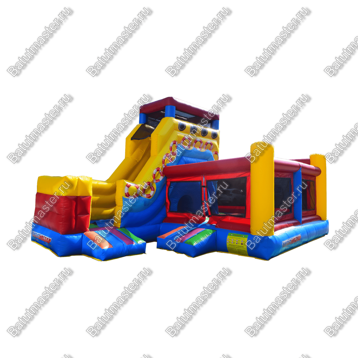 - вторая секция – батут, оснащенный надежными надувными столбиками желтого и синего цветов, между которыми натянута эластичная сетка, защищающая от травм при прыжках. На входе защита оснащена удобной застежкой, которая надежно соединяет края сетки и облегчает доступ внутрь аттракциона.