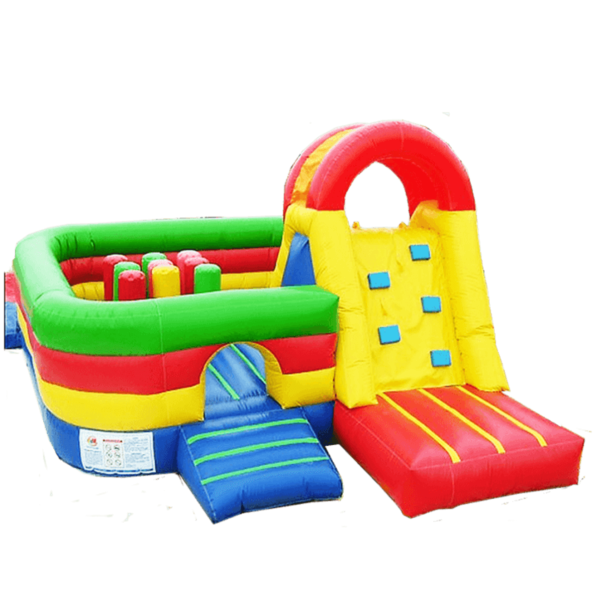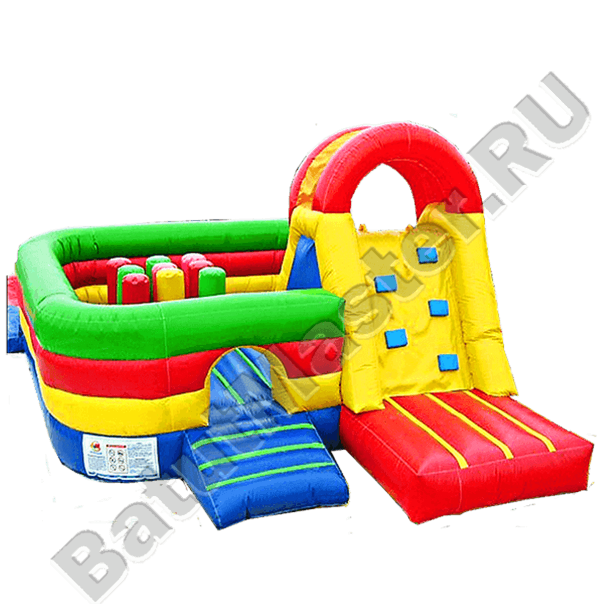 Оригинальный надувной батут подходит для маленьких альпинистов, так как оснащен мини-скалодромом и полосой препятствий в виде надувных столбов, в которых очень весело лазить.