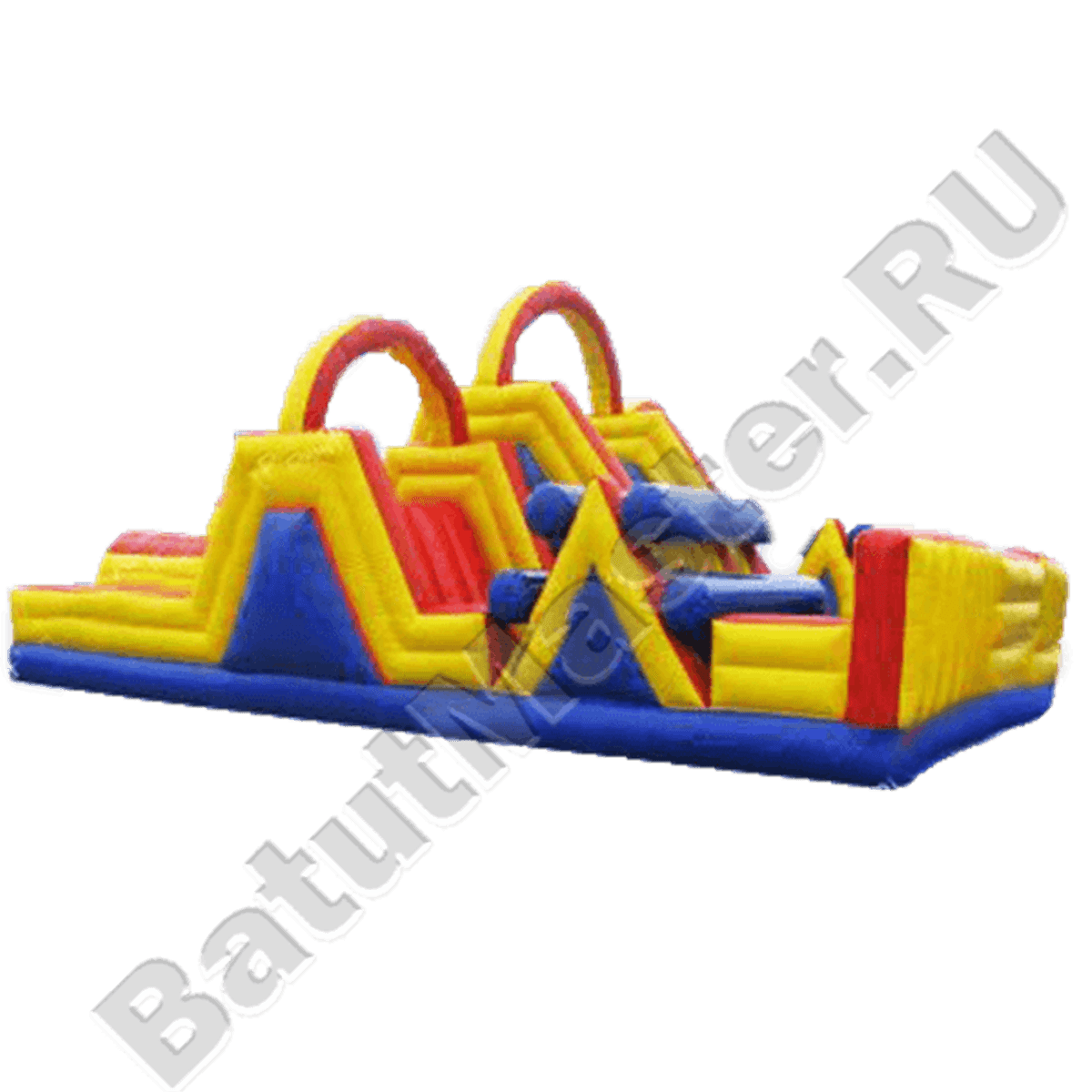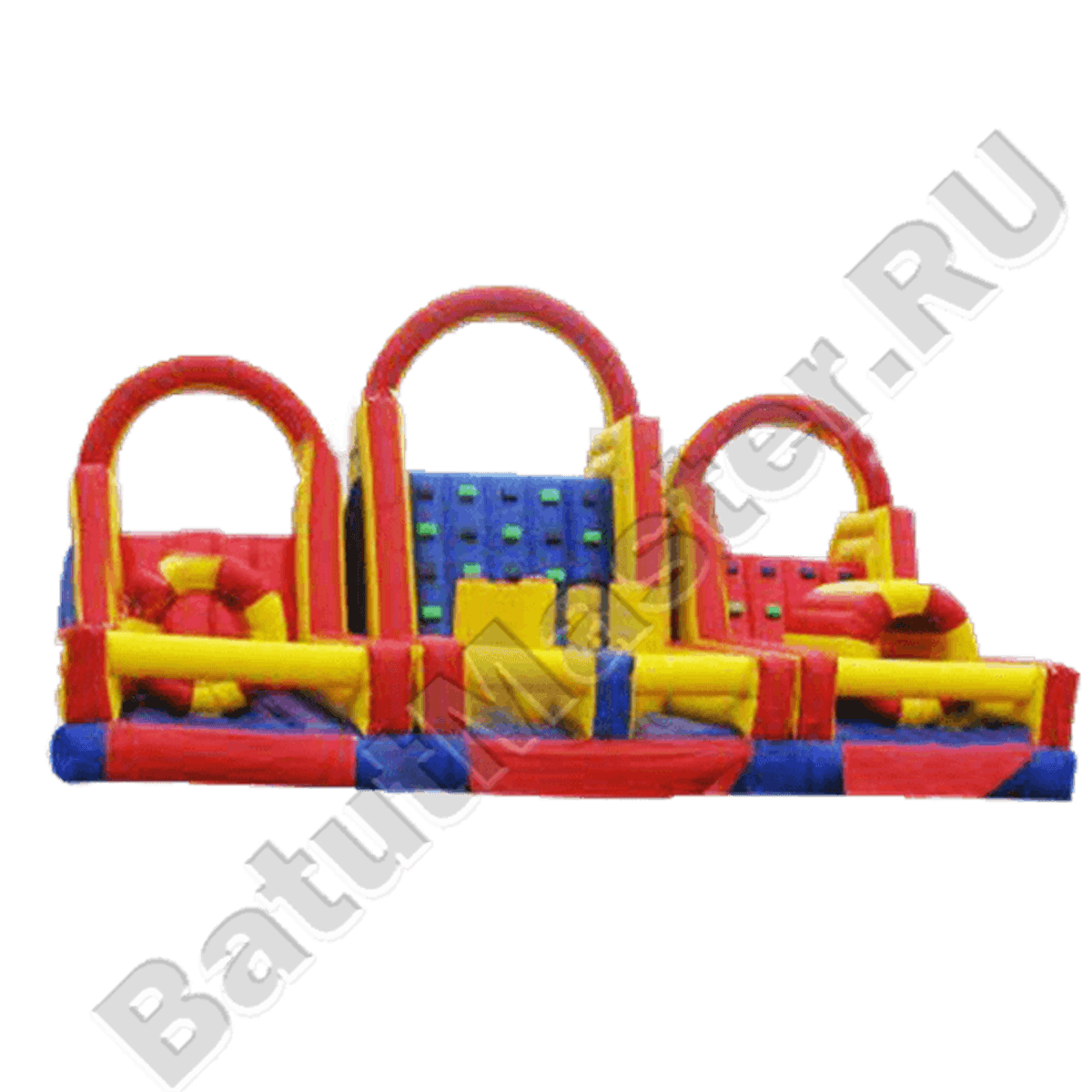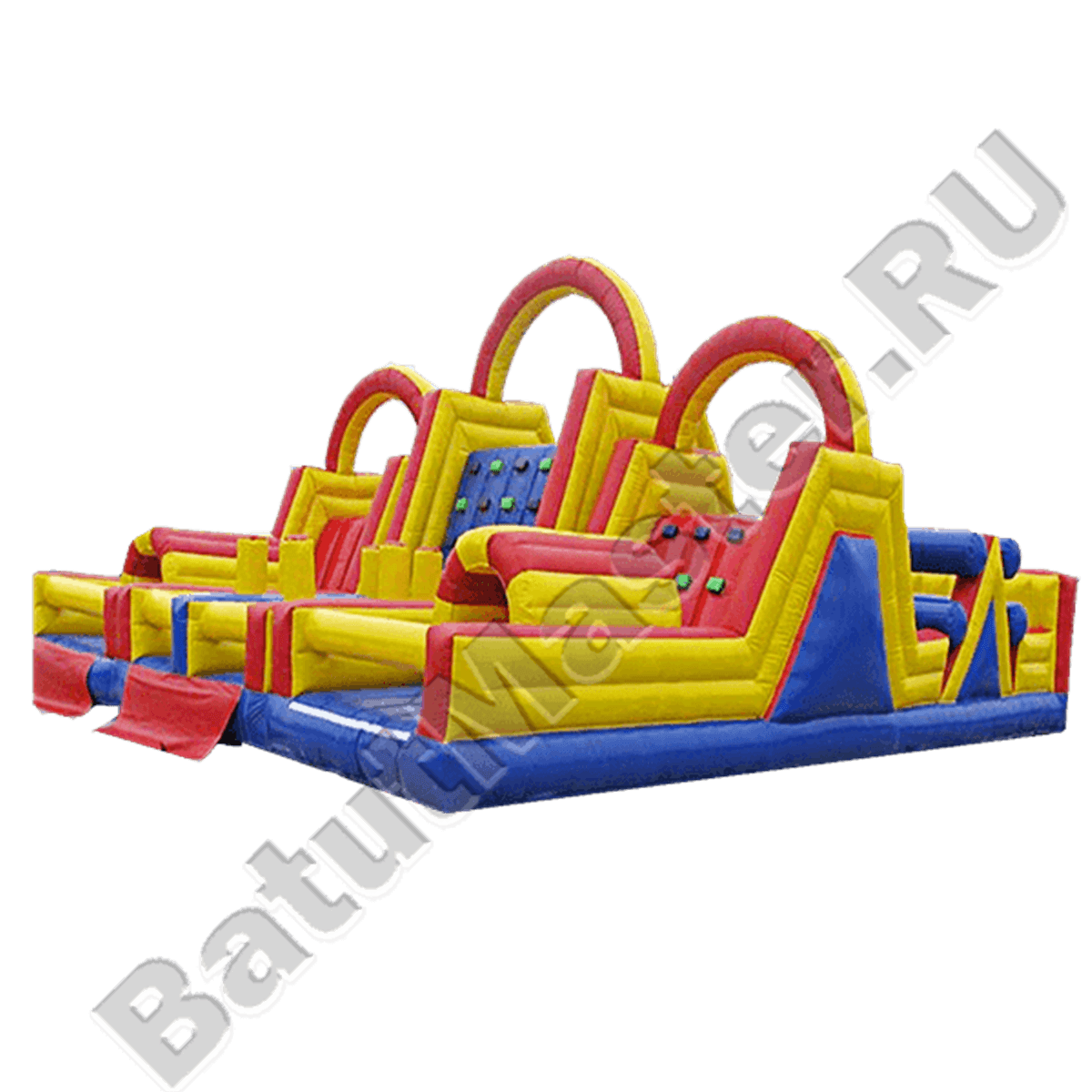 Надувной батут для маленьких спортсменов! Этот аттракцион выполнен в виде полосы препятствий, на которой дети могут устроить увлекательное соревнование. В центре батута расположены три горки, забраться на которые нужно при помощи мини-скалодрома. Дети любят играть в "царя горы" на этом батуте, а самое главное, что совсем не больно падать, забираясь на эти горки, а наоборот очень весело! По краям батута есть защитные стены и надувные опоры, которые не дадут ребятам выпасть из батута.