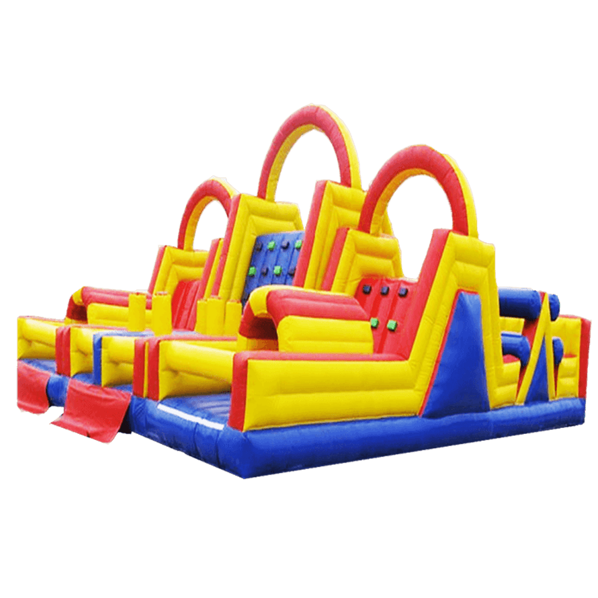 Основные элементы выполнены из желтого и красного ПВХ, поверхность внизу окрашена в синий цвет. Баррикады– красные, но по центру – синяя. Если преграды начинаются с желтого валика, то заканчиваются они невысокой надувной стенкой из желто-красного материала.