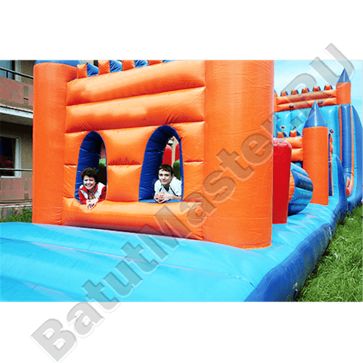 Встречает игровая прыгающая площадка желтыми крепостными вратами с синими башенками, после преодоления которых, будет несколько барьеров – 2 зеленых и один красный. Дальше детей ждут туннели в виде пушек, раскрашенных в синюю и желтую полосы. Небольшой перерыв на надувной веселой платформе и вот уже вторые ворота, такие же желтые под синими конусообразными башнями.