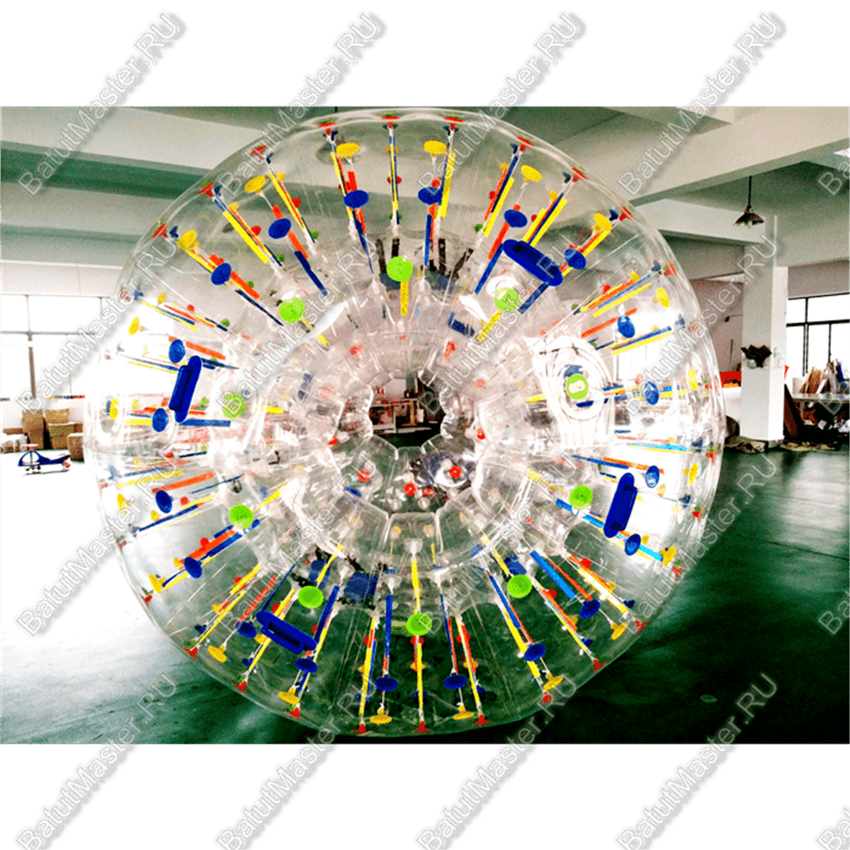 Во-вторых, зорб весьма красочный, стоит только посмотреть на него в вечернее время суток. Он светящийся, а светящиеся элементы добавляют красочности и насыщенности аттракциону. В движении это будет смотреться просто фантастично.