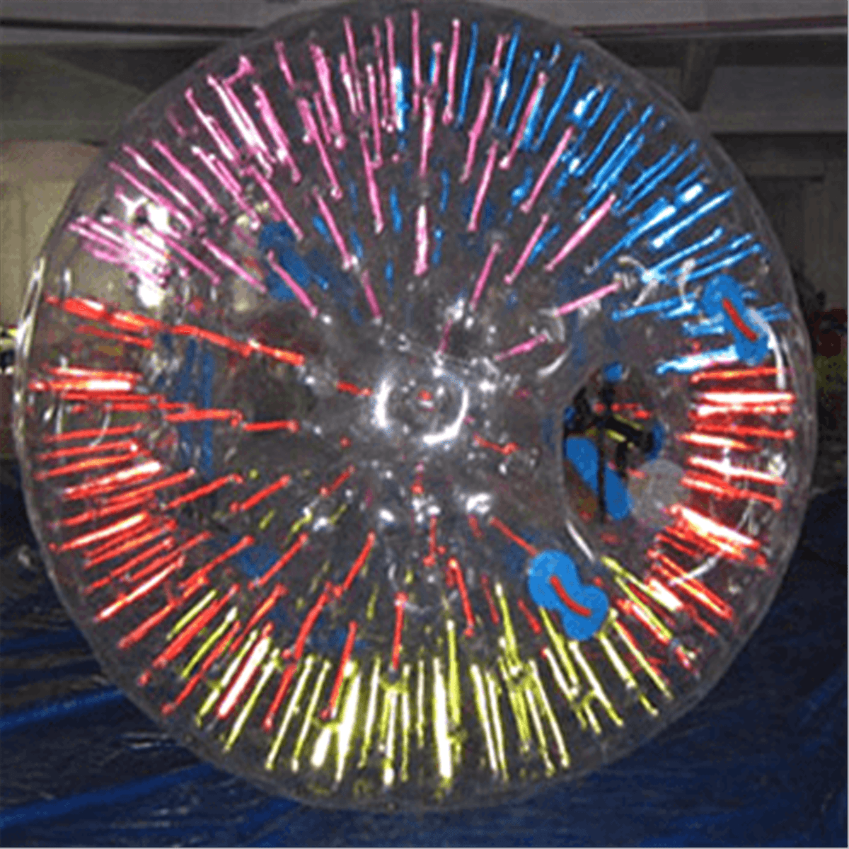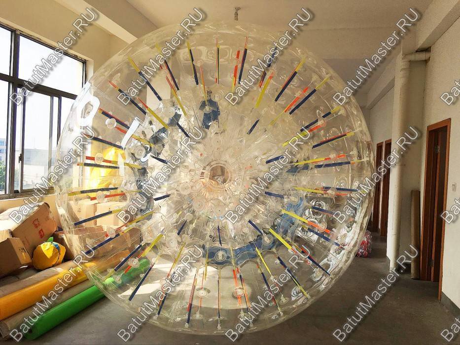 Светящийся зорб для бизнеса в представленном формате представляет собой уникальную конструкцию, которая с наступлением темноты светится разными красками. Это стропы, которые натянуты между сферами. В свою очередь атрибут полностью прозрачный и находясь внутри человеку легко контролировать за происходящим снаружи.