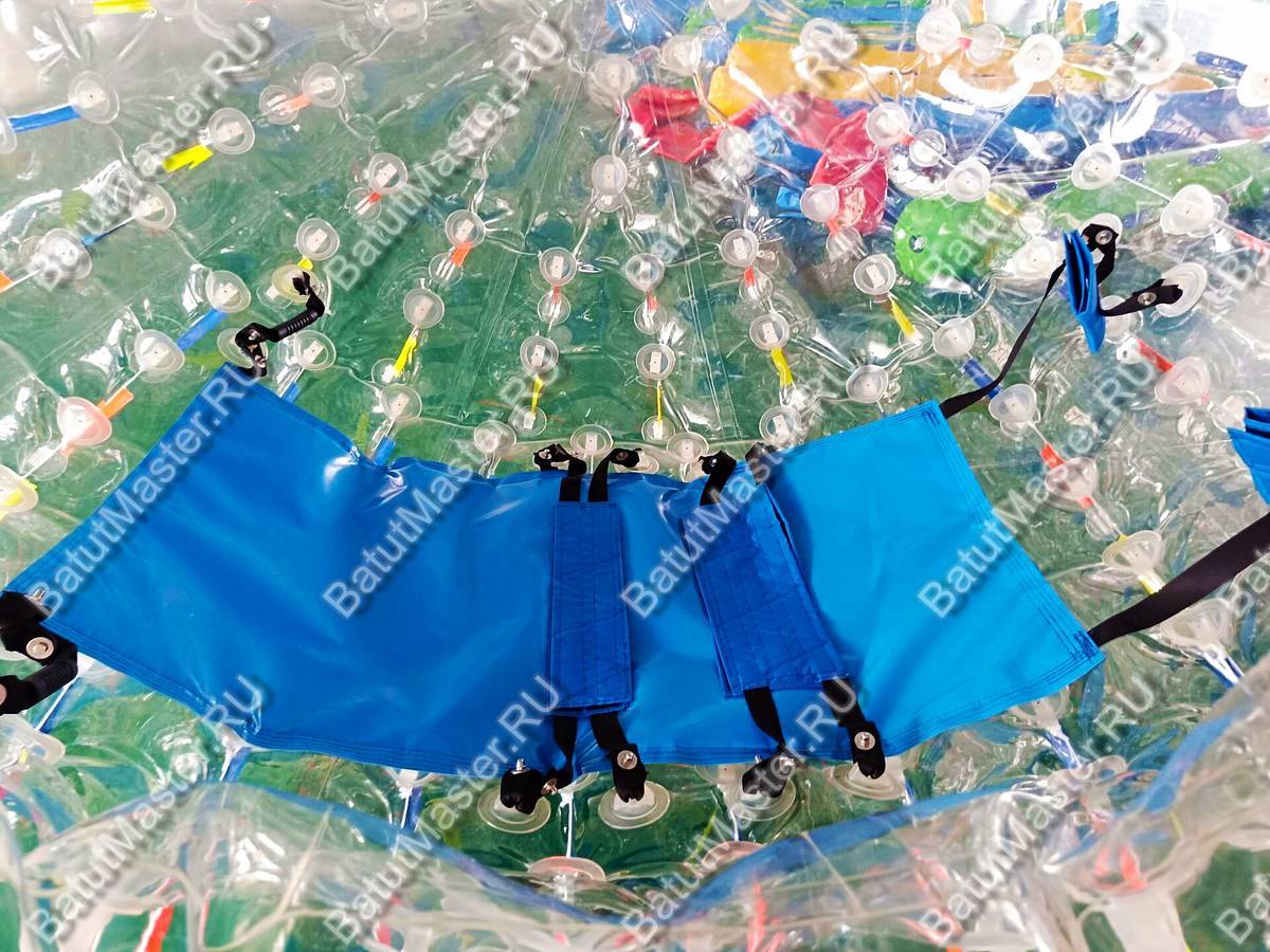 Зорб "Neo" оснащен яркими аксессуарами, с каждой стороны сквозь прозрачную основу видны соединительные стропы неоновых тонов - синего, красного, желтого или лилового тона