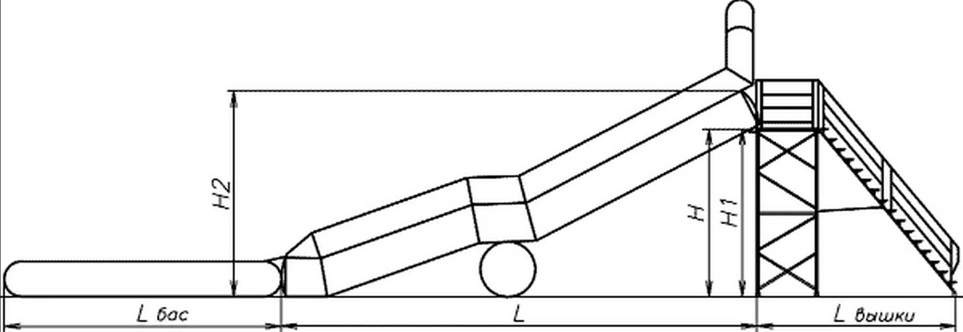 Расположение вышки-опоры определяется с учетом величины L, указанной в технических характеристиках горки. Высота вышки рассчитывается по формуле: