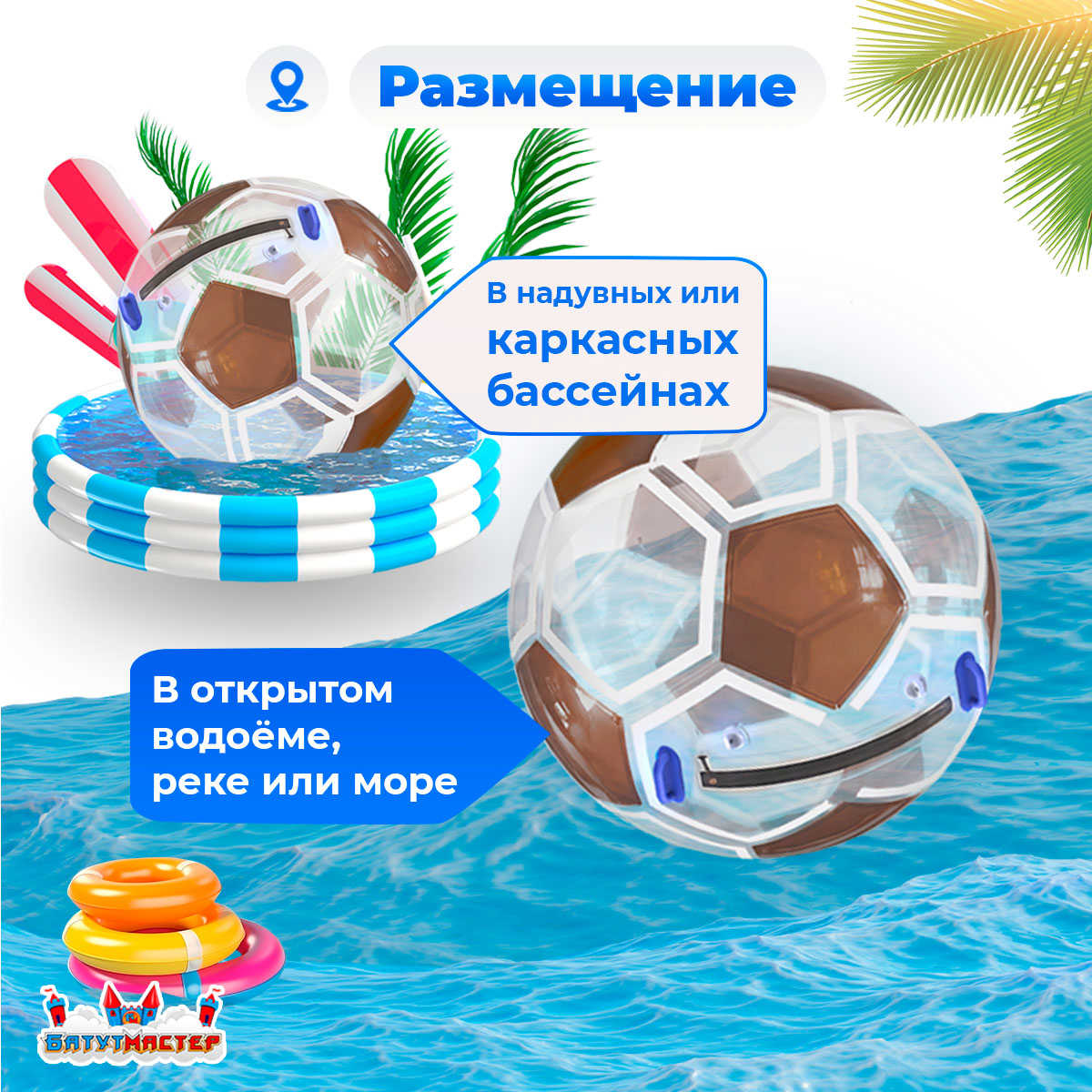 Вы можете использовать водный шар в самых разных местах. Главное условие — вода глубиной от 0,5 до 1 метра.
