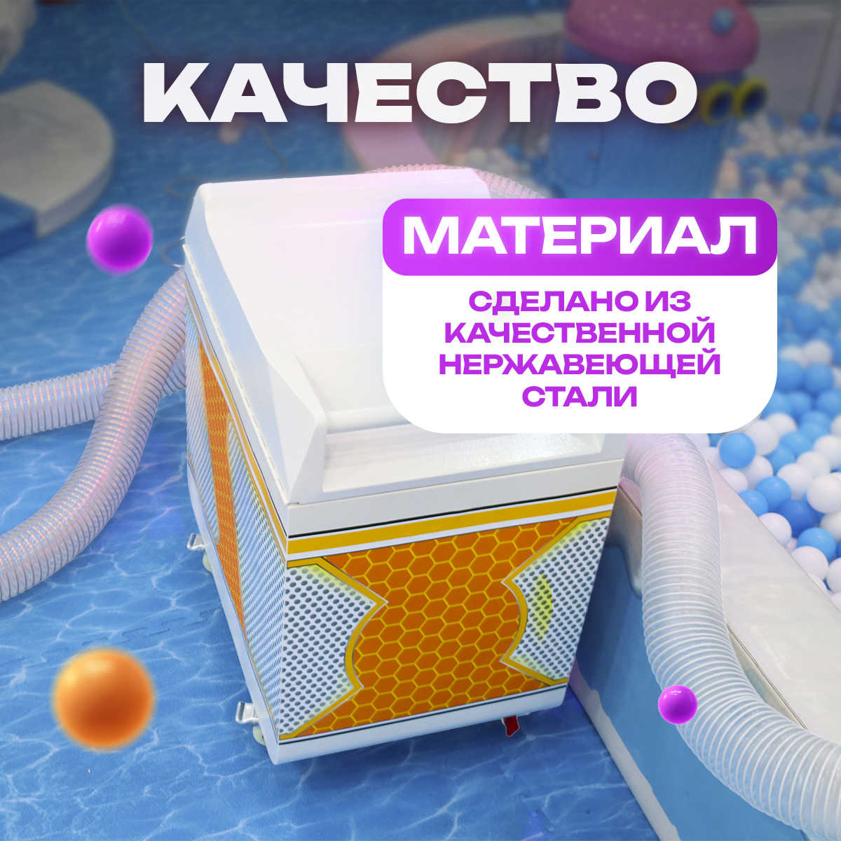 Агрегат для постоянной чистки и дезинфекции шариков в сухом бассейне – важный элемент оборудования аттракциона. Шаромойка от компании ЛабиринтМастер в течение дня обеспечивает непрерывную чистку шаров, проводит дезинфекцию каждого элемента, помогая обеспечивать санитарно-гигиенические требования.
