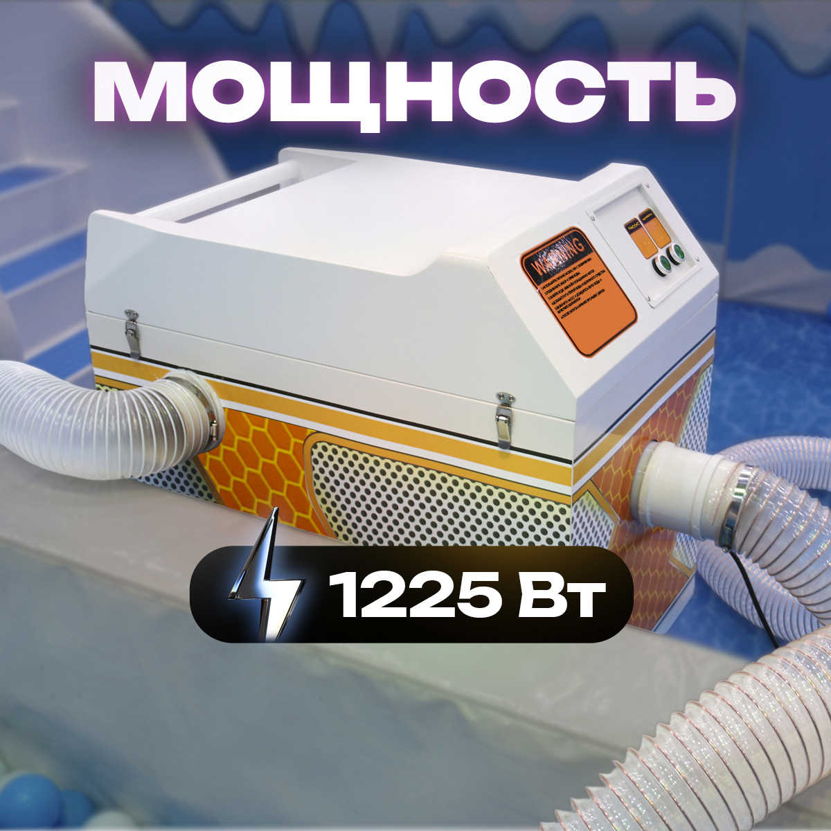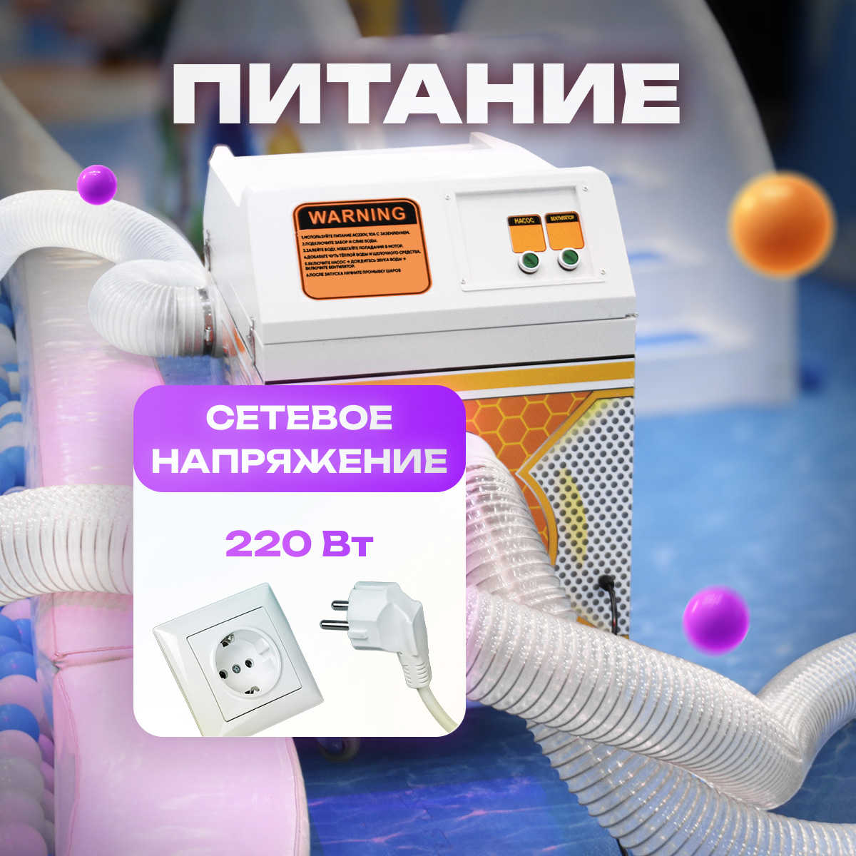 Шаромойка полностью готова к эксплуатации. Для начала дезинфекции необходимо подсоединить входной и выходной шланги, свободные концы которых опускают в бассейн. После включения шаромойки входной шланг начинает под давлением вместе с воздухом затягивать шары внутрь корпуса, где они обрабатываются, а затем направляются по выходному шлангу обратно в бассейн.