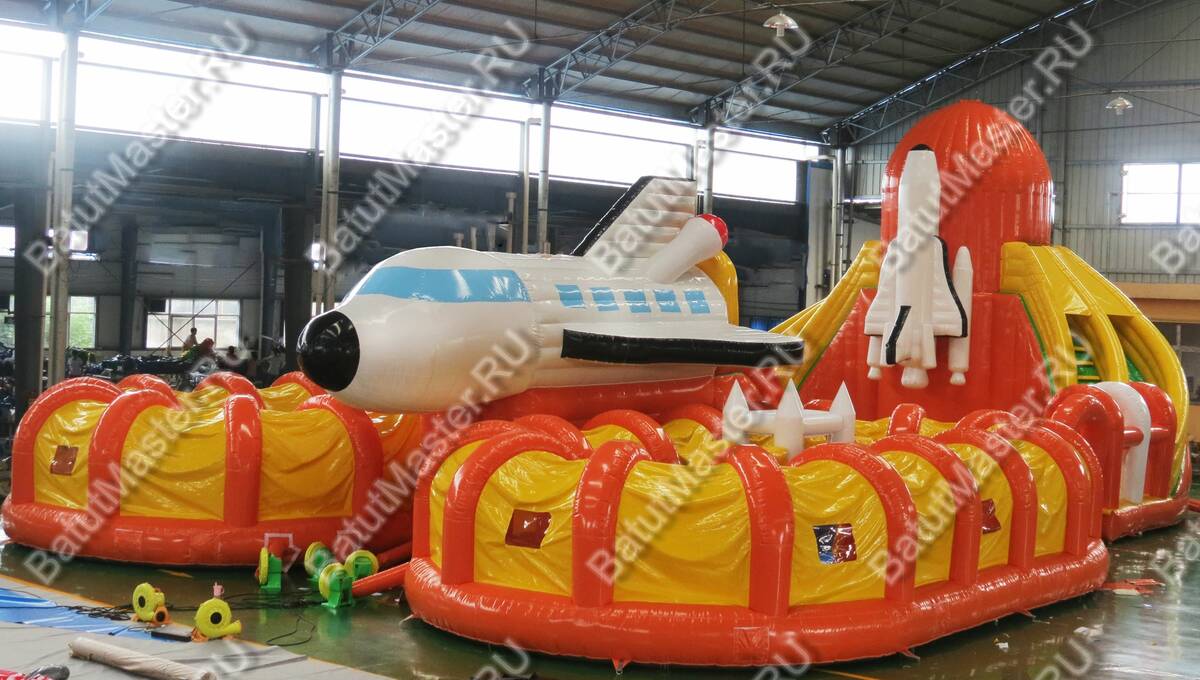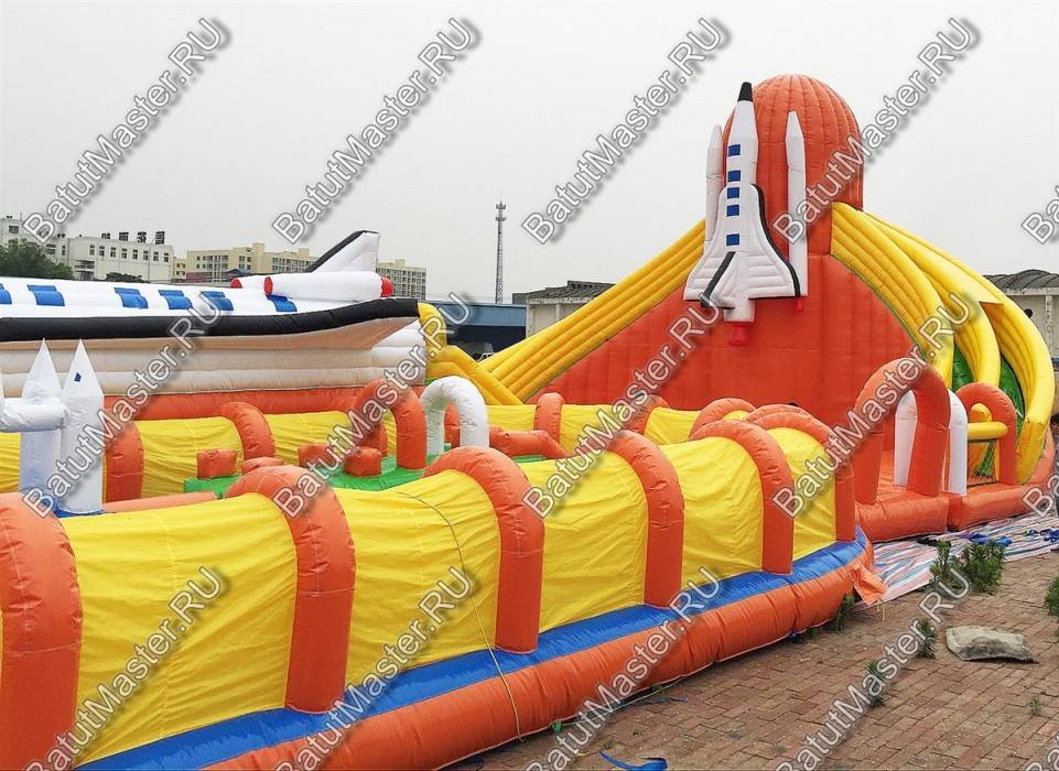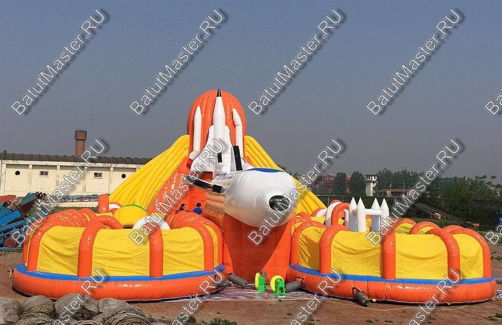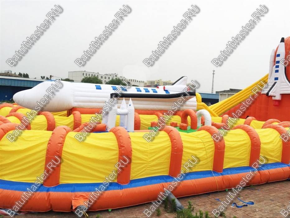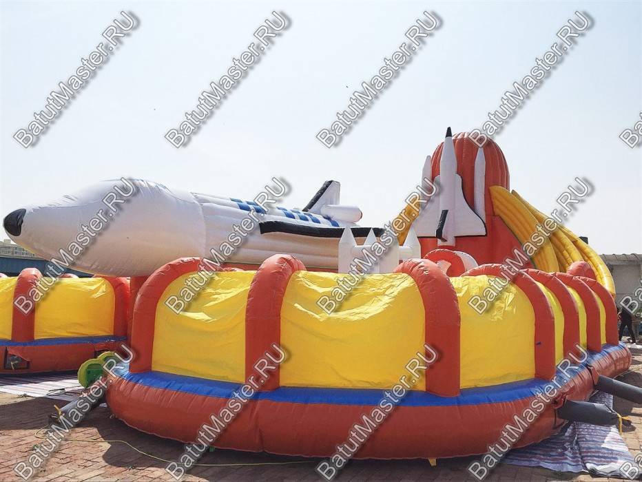 Этот габаритный аттракцион виден издалека, посередине комплекса установлен огромный надувной космический шатл. Сзади надувной фигуры расположена небольшая горка с мягкими ступенями, спустившись вниз, ребята попадают в прыгательную зону, откуда есть переходы в другие части массивного развлекательного аттракциона. Большая площадь батута позволяет находиться там не только малышам, но и взрослым, что вдвойне увлекательно.