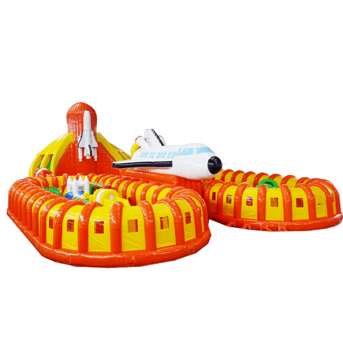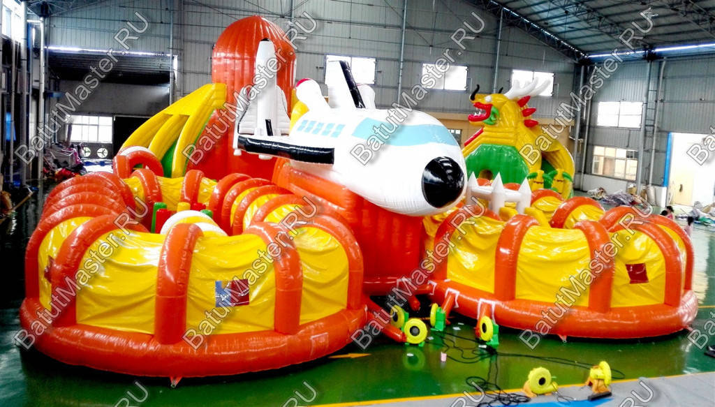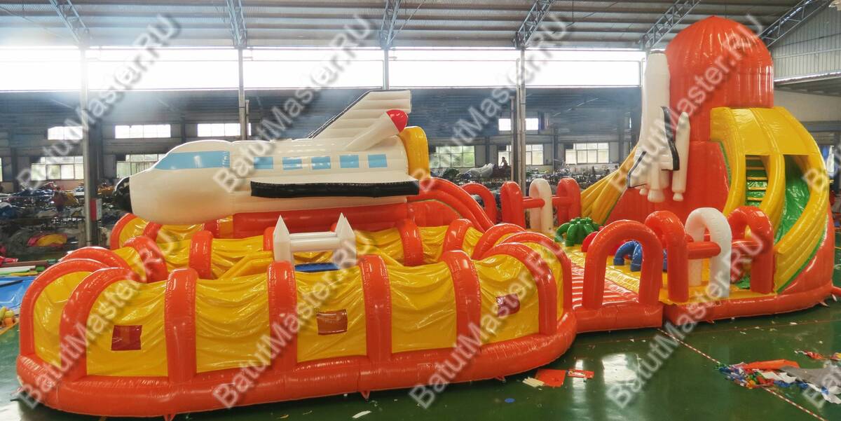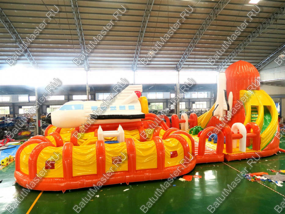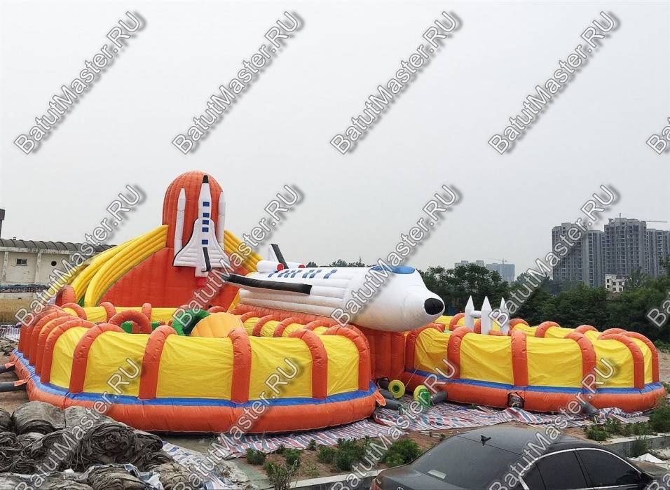 Этот габаритный аттракцион виден издалека, посередине комплекса установлен огромный надувной космический шатл. Сзади надувной фигуры расположена небольшая горка с мягкими ступенями, спустившись вниз, ребята попадают в прыгательную зону, откуда есть переходы в другие части массивного развлекательного аттракциона. Большая площадь батута позволяет находиться там не только малышам, но и взрослым, что вдвойне увлекательно.