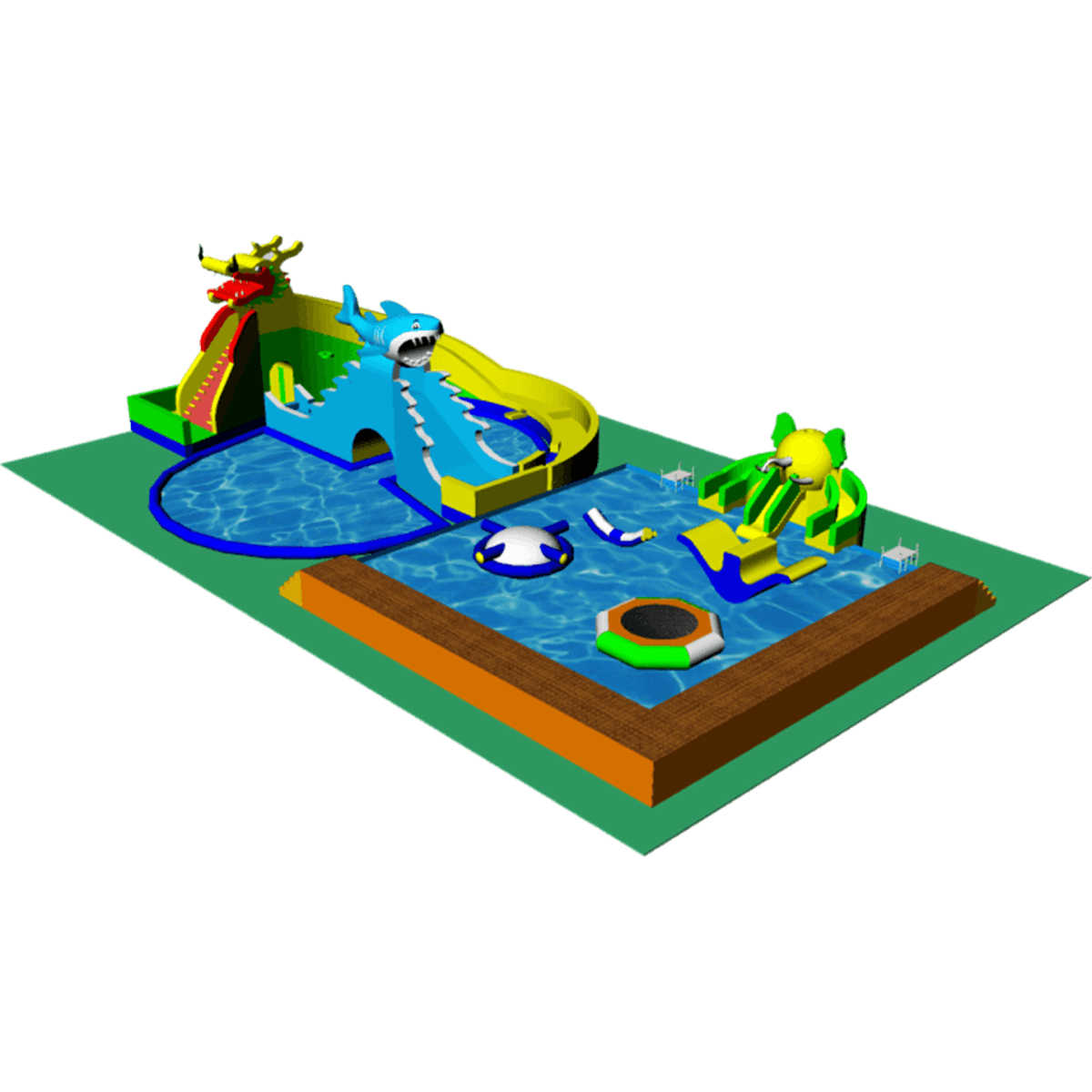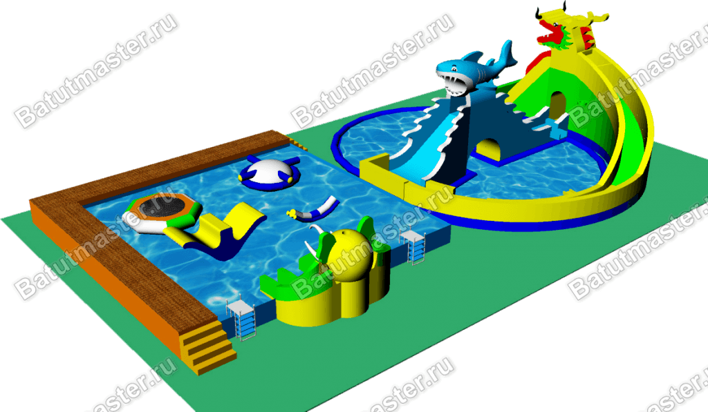 Надувной аквапарк состоит из двух больших бассейнов, один из которых круглой формы, а другой – квадратной. У каждой зоны есть своя игровая фигура, для первого – это акула с огромной открытой пастью, находящаяся над аркой, а для второго – забавный слон в желто-зеленых цветах и с двумя горками. На квадратном аттракционе расположены и другие развлечения из плотного материала ПВХ: батут, качели наперевес, и водная мина.