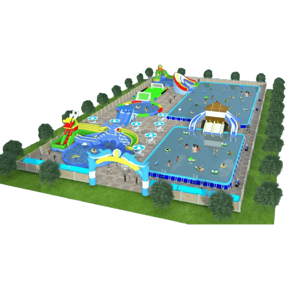 Парк водных аттракционов, выполненный в неожиданных и самых ярких цветах. Начинается комплекс надувных аттракционов с привлекательной арки, над которой поместились дельфины, играющие с мячом. После входа небольшие надувные конструкции идут с левой стороны, а с правой расположены 2 бассейна прямоугольной формы и почти одинакового размера. Соединяет их небольшой домик в виде нескольких горок: 4 спуска волнистые и еще 4 просто ровные.