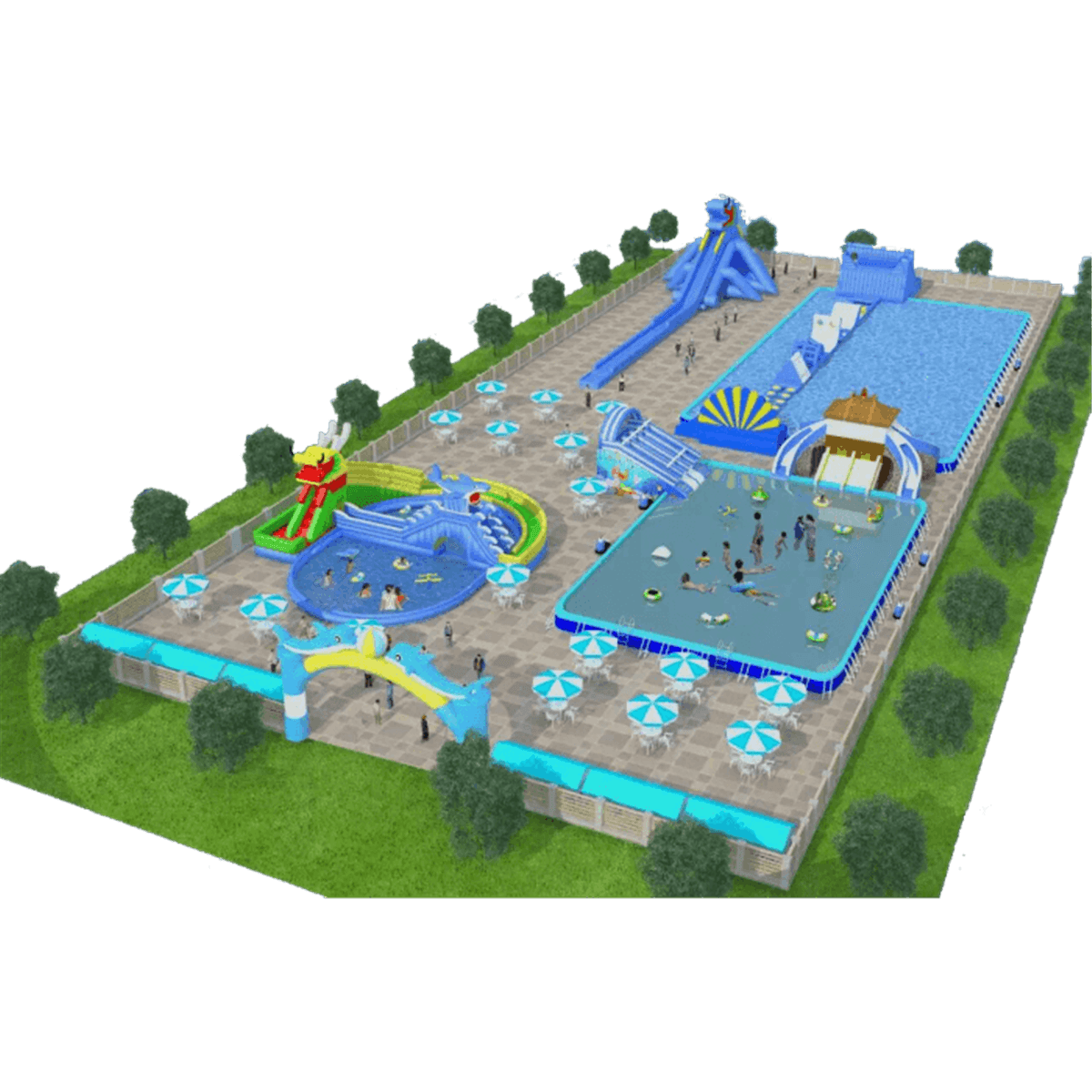 Просторный и вместительный надувной водный комплекс занимает огромную площадку прямоугольной формы, в которую входит 3 бассейна разных конструкций. Вход выглядит как широкая арка с голубыми дельфинами и мячом. По всей территории расставлены зонтики от солнца с удобными стульями и столами, поэтому посетители могут отдохнуть в любой зоне, если устанут.