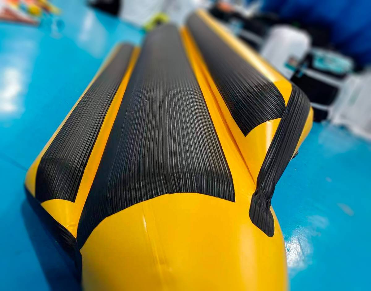 Корпус банана изготовлен из армированного непрозрачного ПВХ плотностью 1100 г/м² и толщиной 0,9 мм. Все швы сварены внахлест шириной 2,5 см, что делает конструкцию герметичной и устойчивой к внешним нагрузкам.