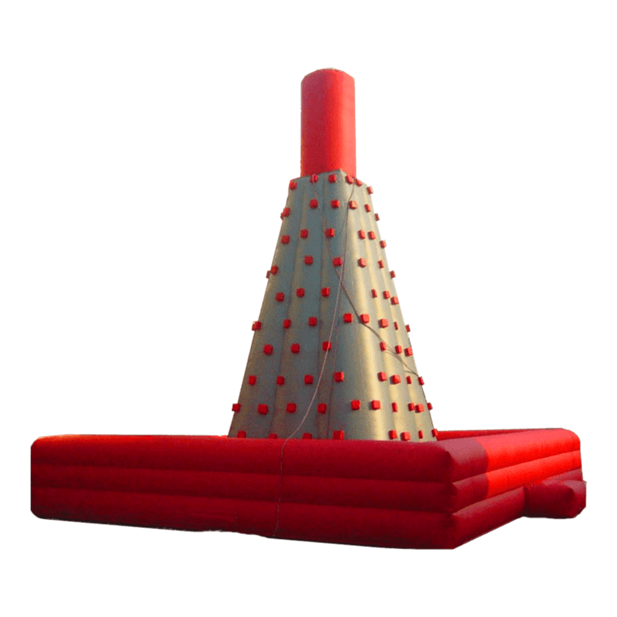 По периметру аттракцион обнесен невысоким красным надувным ограждением, а в самом центре установлен высокий пирамидальный скалодром, внутри которого проходит красный круглый стержень. Этой верхушкой он и заканчивается, поэтому конструкция получается яркой и в то же время простой. По основному серому полю скалы размещаются ярко красные фиксаторы для ног, при помощи их ребенок и достигает самой вершины. Посетители смогут соревноваться в лазании даже без специальных навыков, полученных ранее.