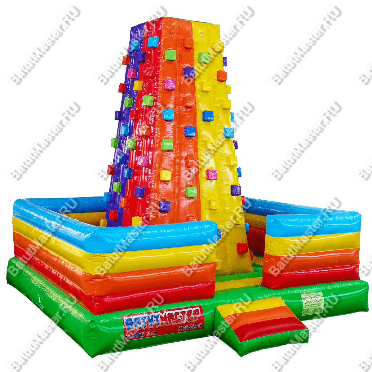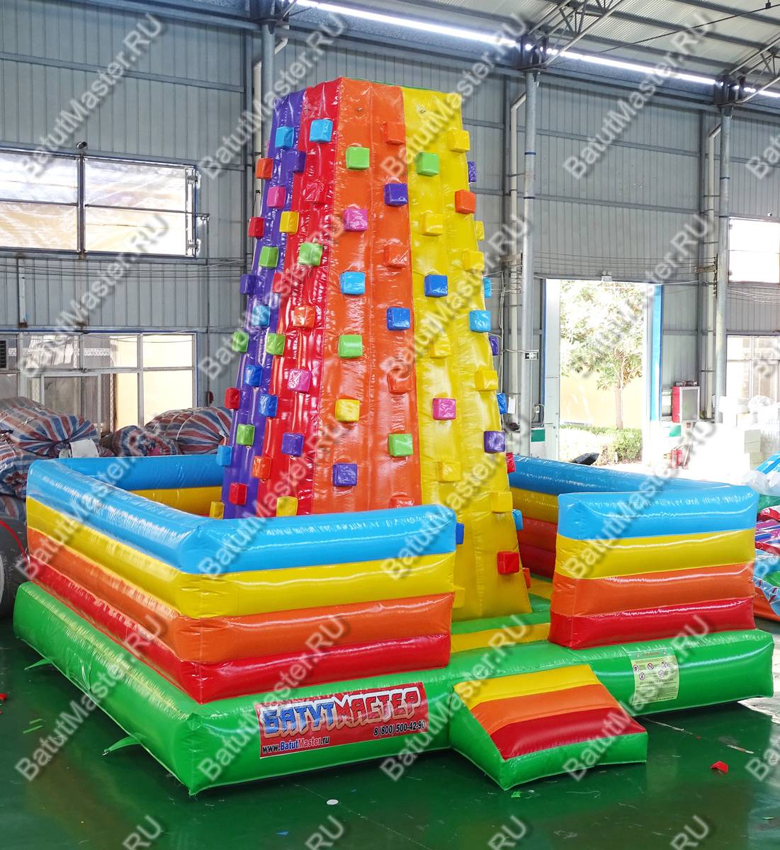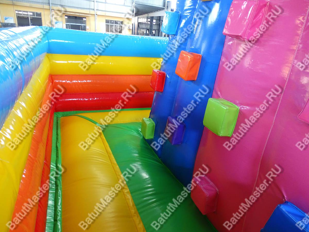 Чтобы показать детям надувной мир аттракционов с более интересной стороны, идеально подойдет огромная вертикальная скала серого цвета с разноцветными фиксаторами для ног и рук. Она удобно разделена на небольшие полосы, поэтому детям будет комфортно занять свою линию и двигаться вверх по своему пути. Находится скалодром внутри прямоугольной площадки с красно-синим невысоким ограждением из ПВХ. Аттракцион полностью лишен декоративных фигур, если не считать фиксаторов.