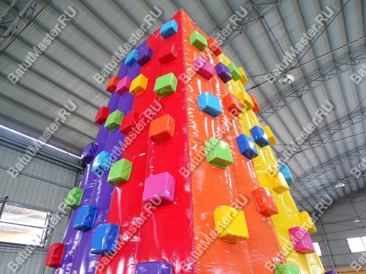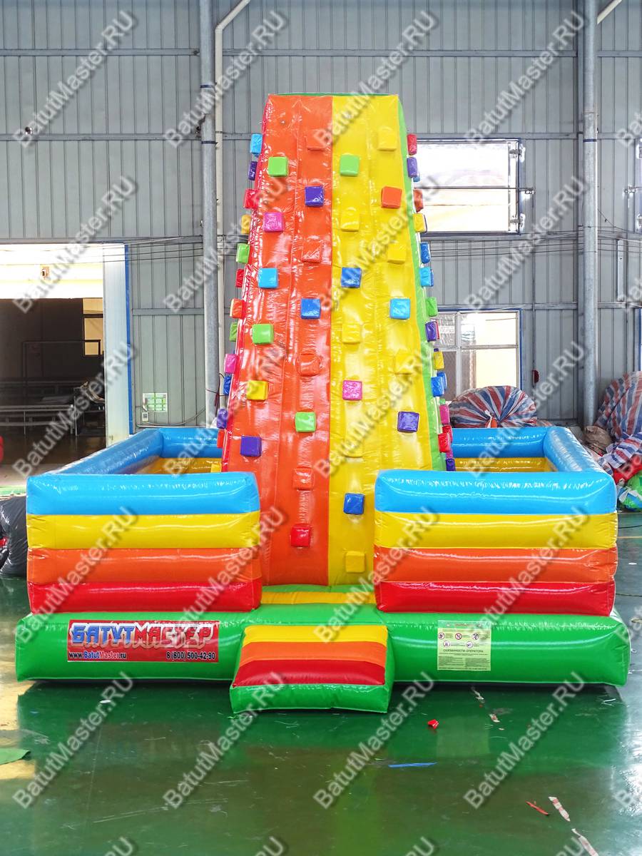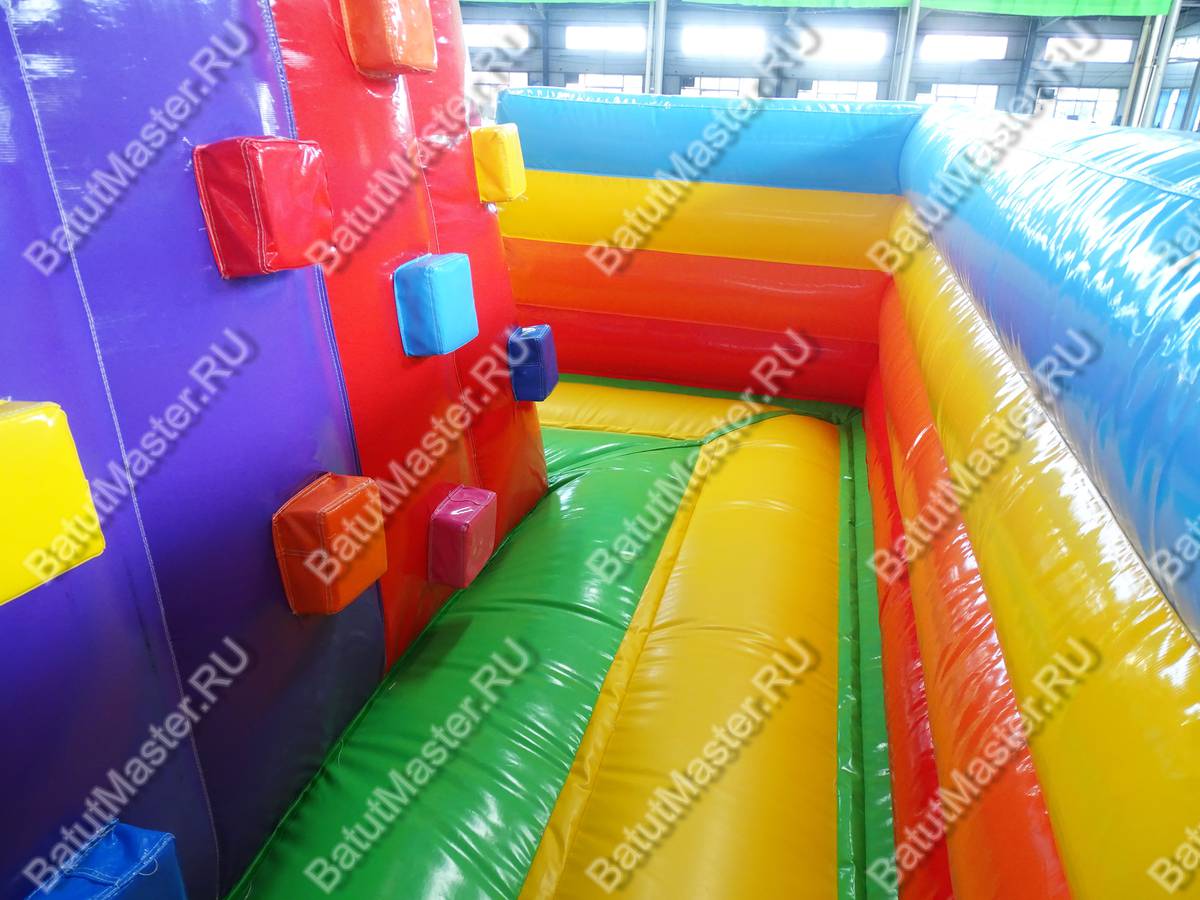Чтобы показать детям надувной мир аттракционов с более интересной стороны, идеально подойдет огромная вертикальная скала серого цвета с разноцветными фиксаторами для ног и рук. Она удобно разделена на небольшие полосы, поэтому детям будет комфортно занять свою линию и двигаться вверх по своему пути. Находится скалодром внутри прямоугольной площадки с красно-синим невысоким ограждением из ПВХ. Аттракцион полностью лишен декоративных фигур, если не считать фиксаторов.