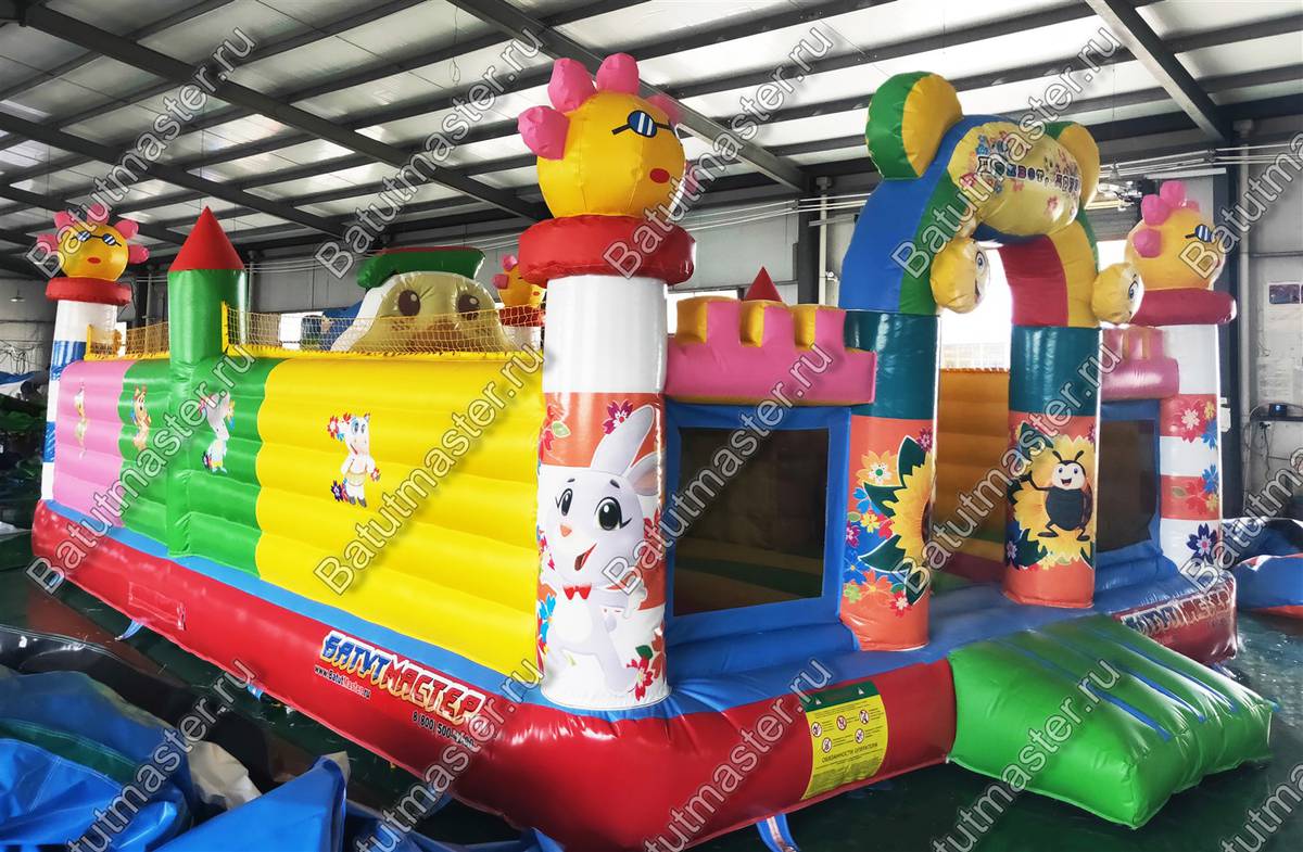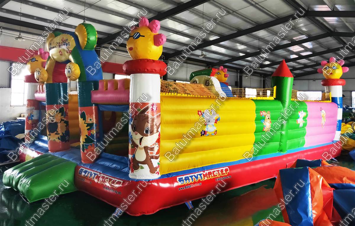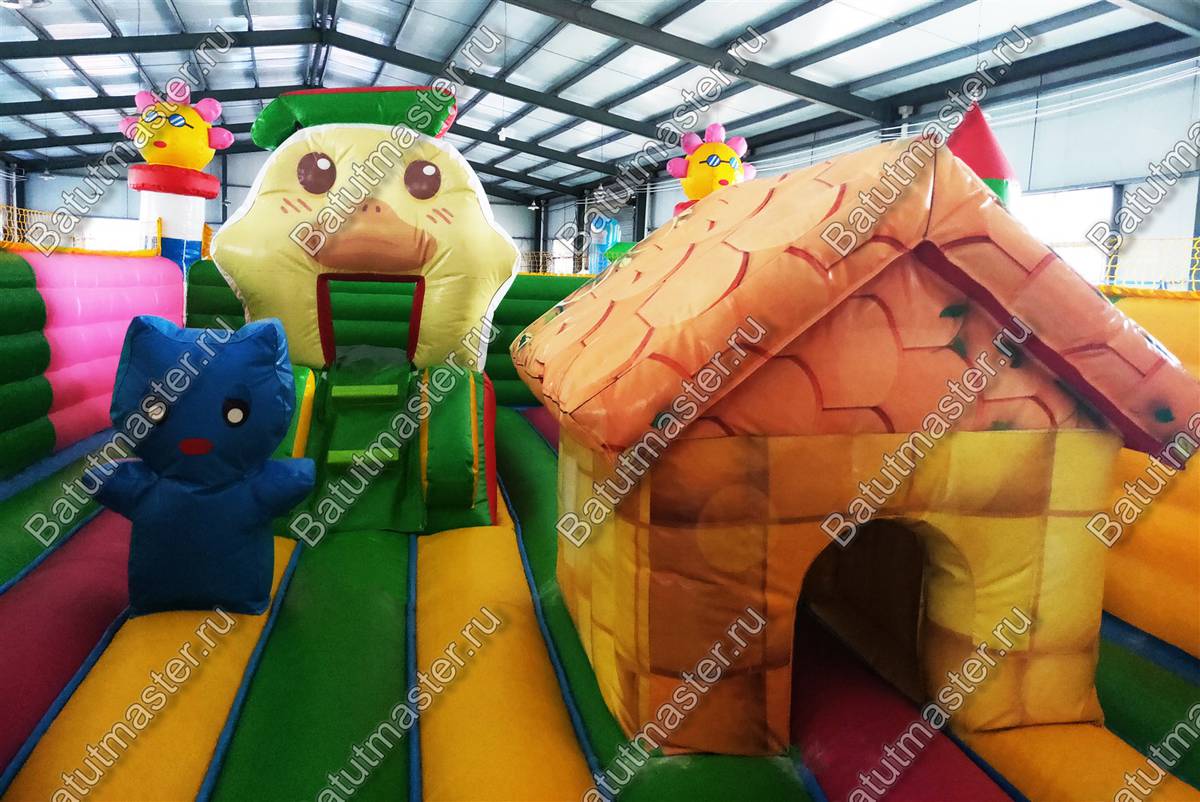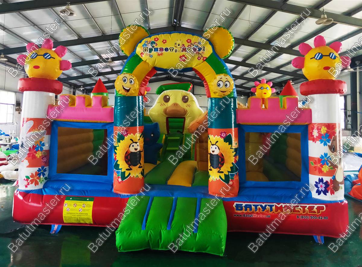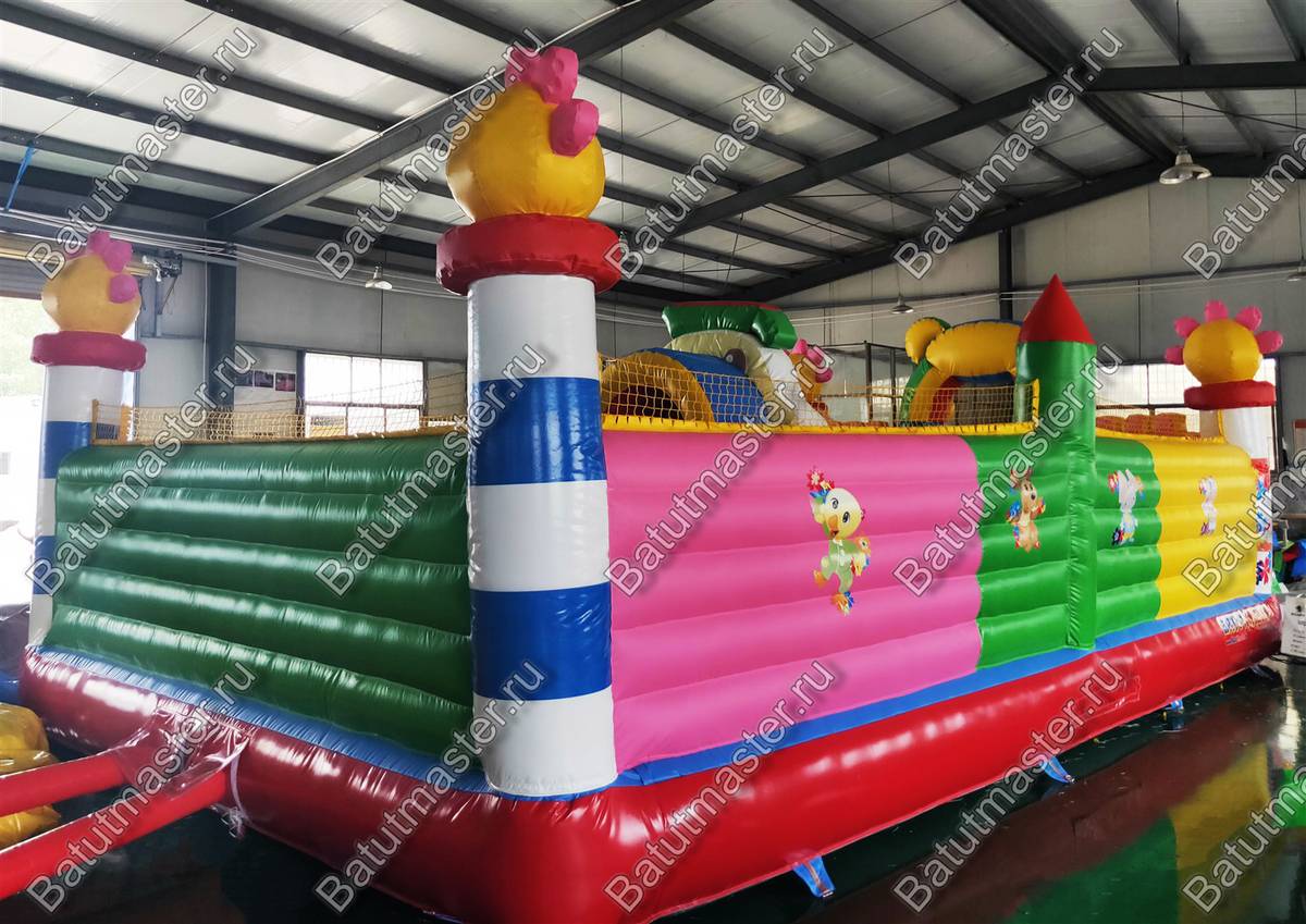 На входе малыша встретит разноцветная арка с надувными цветочками и нарисованными подсолнухами. Внутри для детей приготовлено просторное место для прыжков и для бега с надувным небольшим домиком и большой уточкой в образе уточки. Именно из этой птички выходит небольшая горка. Препятствия и игровые фигуры здесь расставлены по всей территории и в своем большинстве это небольшие фигуры надувных птичек, на которых можно покататься или попрыгать. Аттракцион с такими несложными преградами и невысокой горкой рассчитан на детей младшего возраста, но и детям постарше здесь обязательно найдется место попрыгать и повеселиться.
