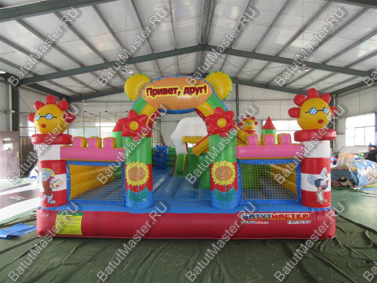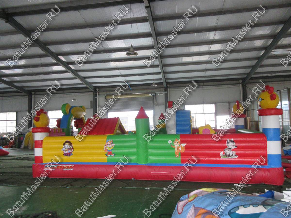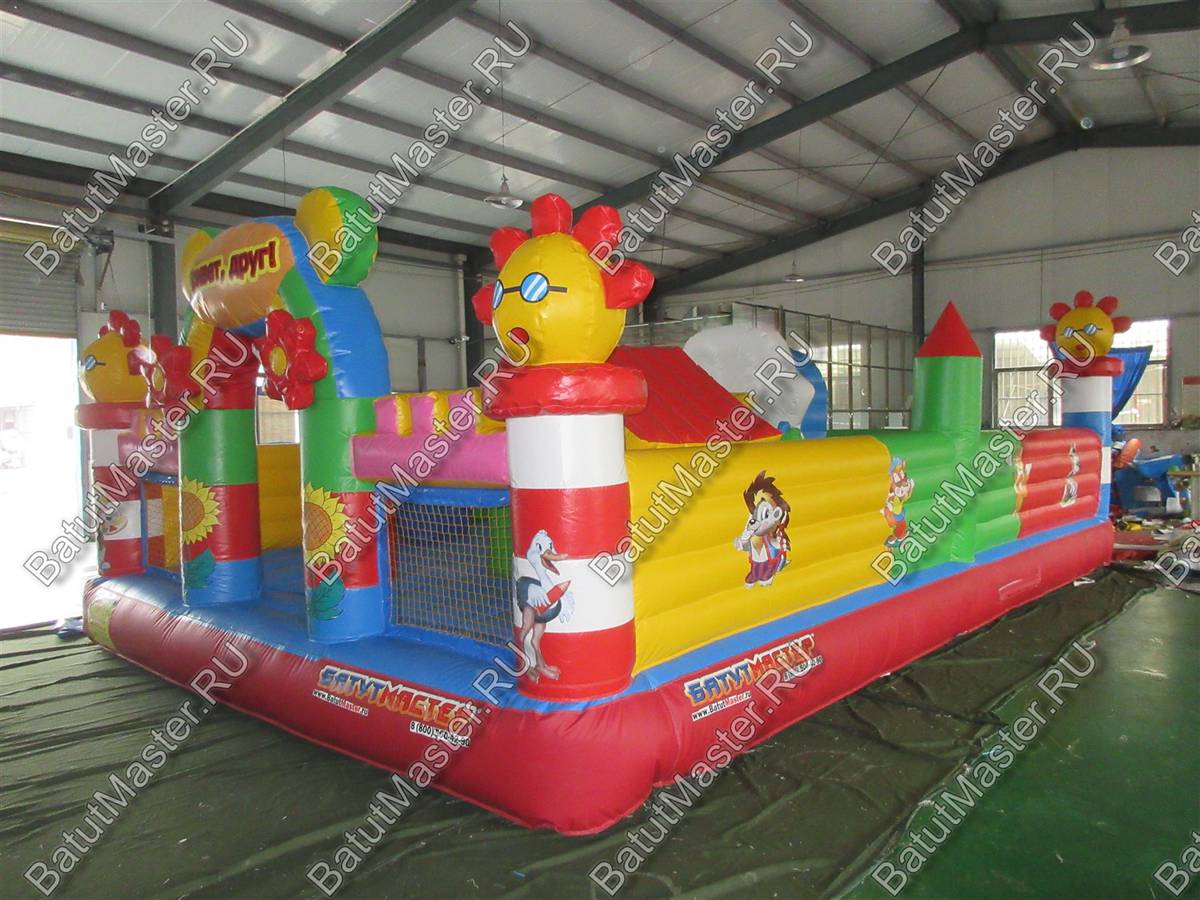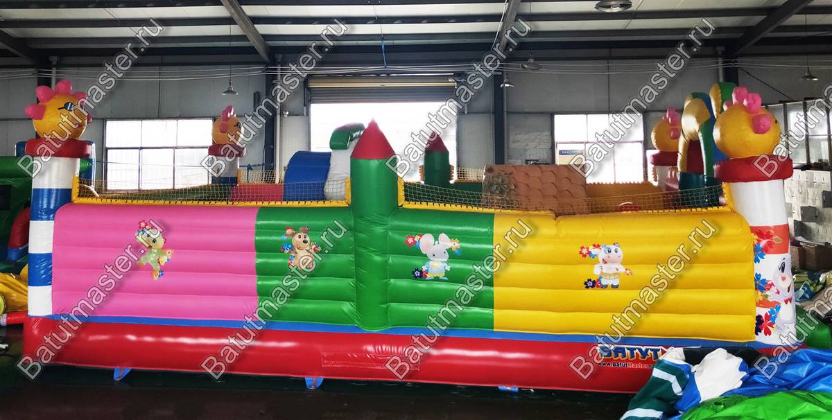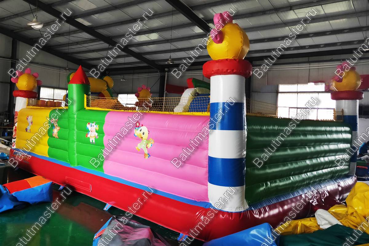 На входе малыша встретит разноцветная арка с надувными цветочками и нарисованными подсолнухами. Внутри для детей приготовлено просторное место для прыжков и для бега с надувным небольшим домиком и большой уточкой в образе уточки. Именно из этой птички выходит небольшая горка. Препятствия и игровые фигуры здесь расставлены по всей территории и в своем большинстве это небольшие фигуры надувных птичек, на которых можно покататься или попрыгать. Аттракцион с такими несложными преградами и невысокой горкой рассчитан на детей младшего возраста, но и детям постарше здесь обязательно найдется место попрыгать и повеселиться.
