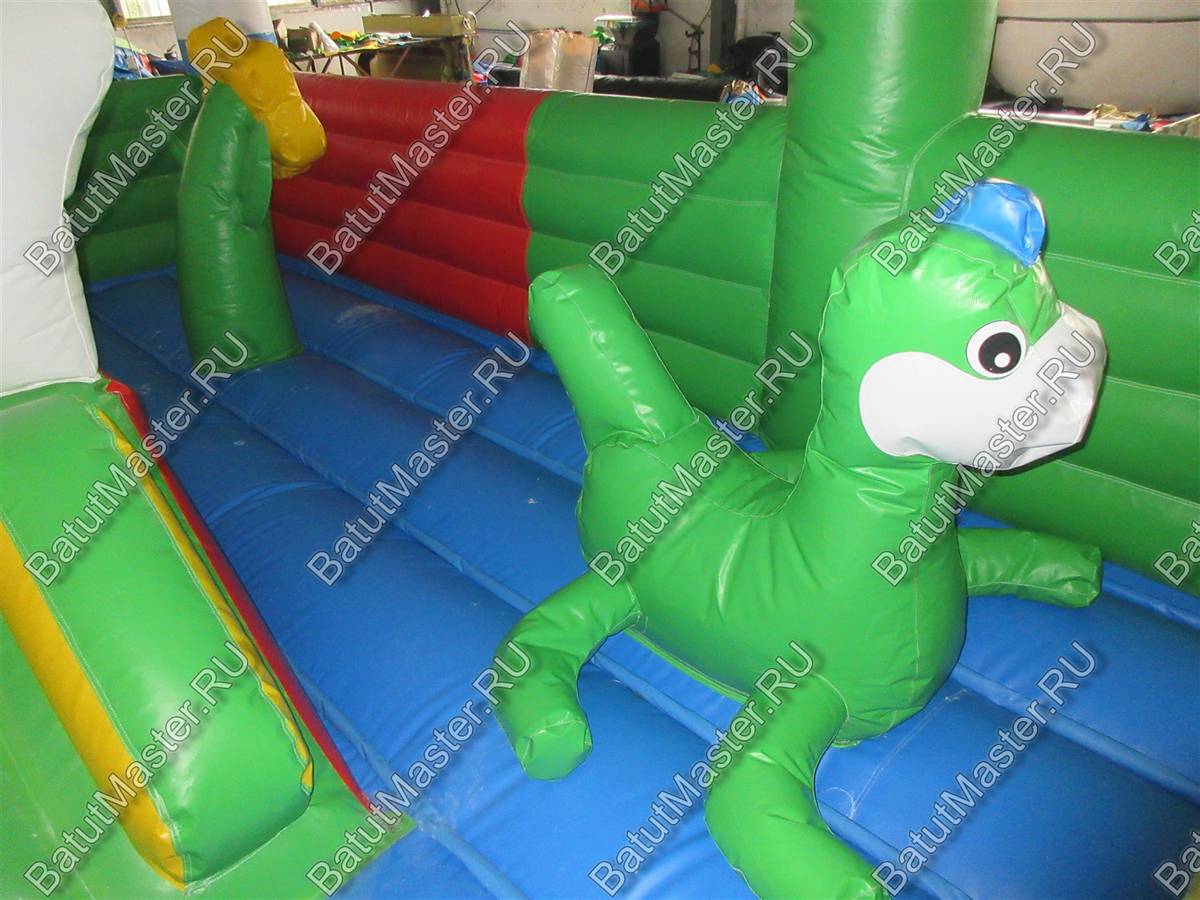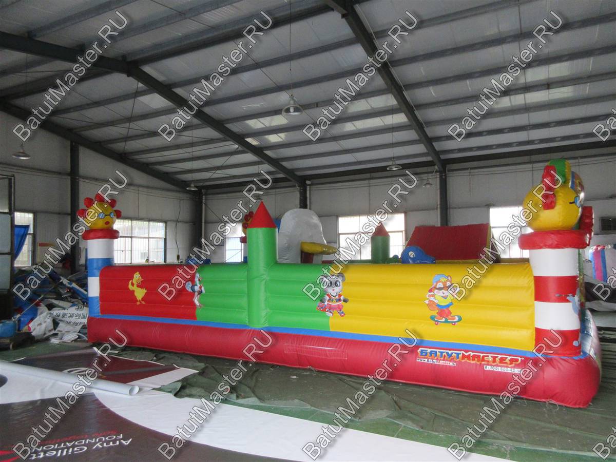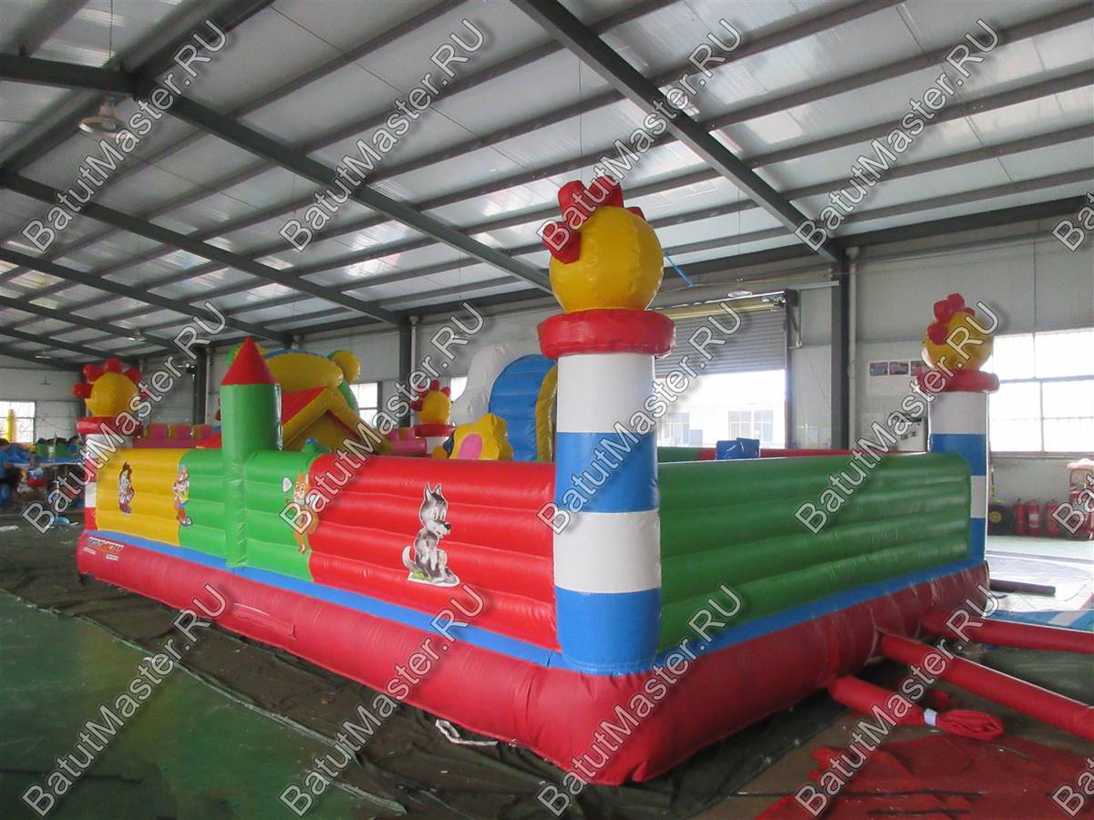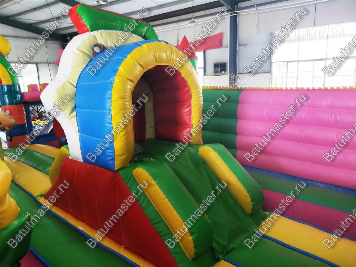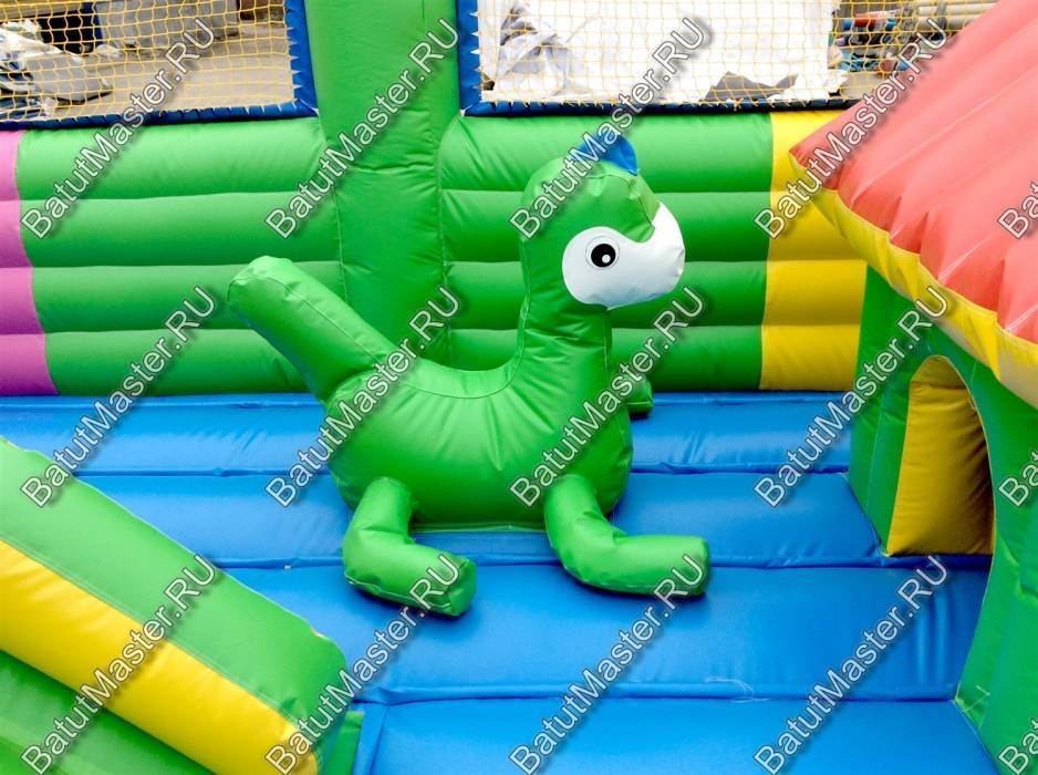 На входе малыша встретит разноцветная арка с надувными цветочками и нарисованными подсолнухами. Внутри для детей приготовлено просторное место для прыжков и для бега с надувным небольшим домиком и большой уточкой в образе уточки. Именно из этой птички выходит небольшая горка. Препятствия и игровые фигуры здесь расставлены по всей территории и в своем большинстве это небольшие фигуры надувных птичек, на которых можно покататься или попрыгать. Аттракцион с такими несложными преградами и невысокой горкой рассчитан на детей младшего возраста, но и детям постарше здесь обязательно найдется место попрыгать и повеселиться.