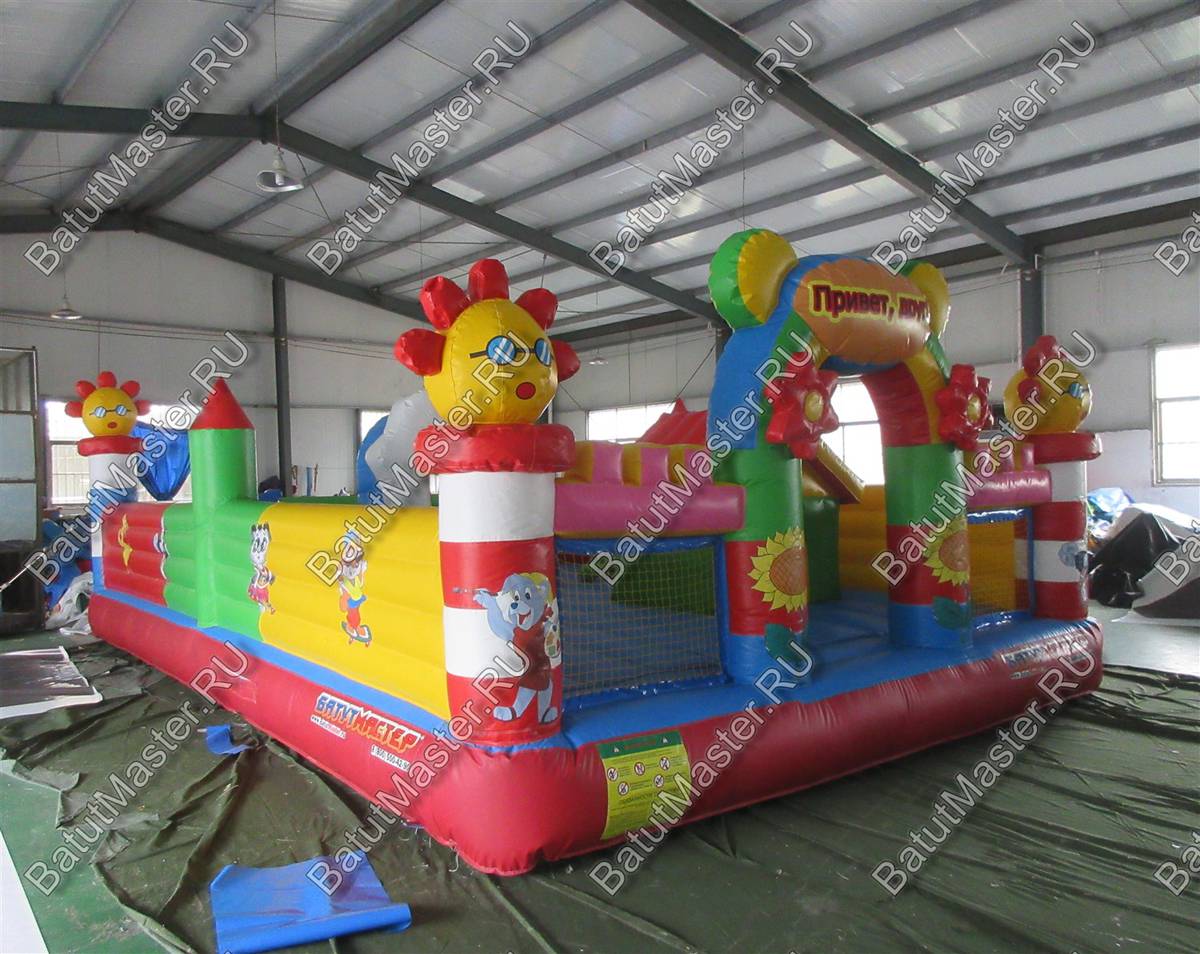 Игровой детский батут с декоративными фигурами изготовлен из самых ярких цветов ПВХ. Конструкция сверху полностью открытая, а со всех сторон по периметру обнесена мягким ограждением из желтых, зеленых и красных секций. На фасадной стороне обе части обтянуты сеткой. Углы батута заполнены яркими бело-красными и бело-синими колоннами, верх которых украшают забавные солнышки с красными надувными лучиками вдоль всей окружности.
