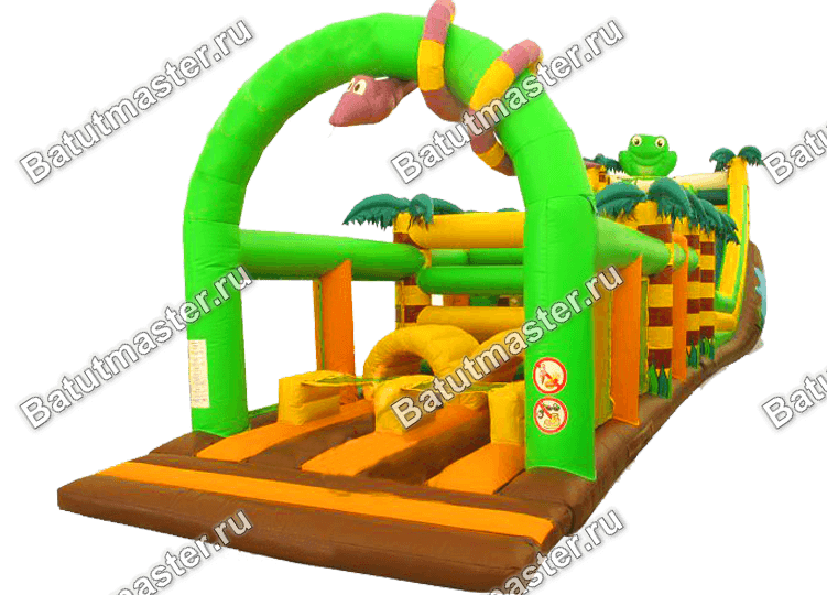Яркий батут представлен в виде удлиненной площадки из полос желтого, коричневого и зеленого ПВХ. Конструкция или мягкий каркас, который находится ближе к входу, сшит из сочно зеленого цвета. Общая цветовая гамма говорит о том, что это путешествие с преградами проходит внутри зарослей джунглей. Чтобы добраться до финишной горки, посетителям обязательно придется осилить большинство игровых фигур и элементов.