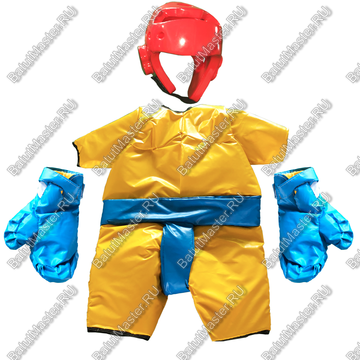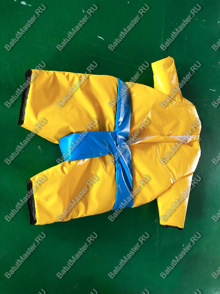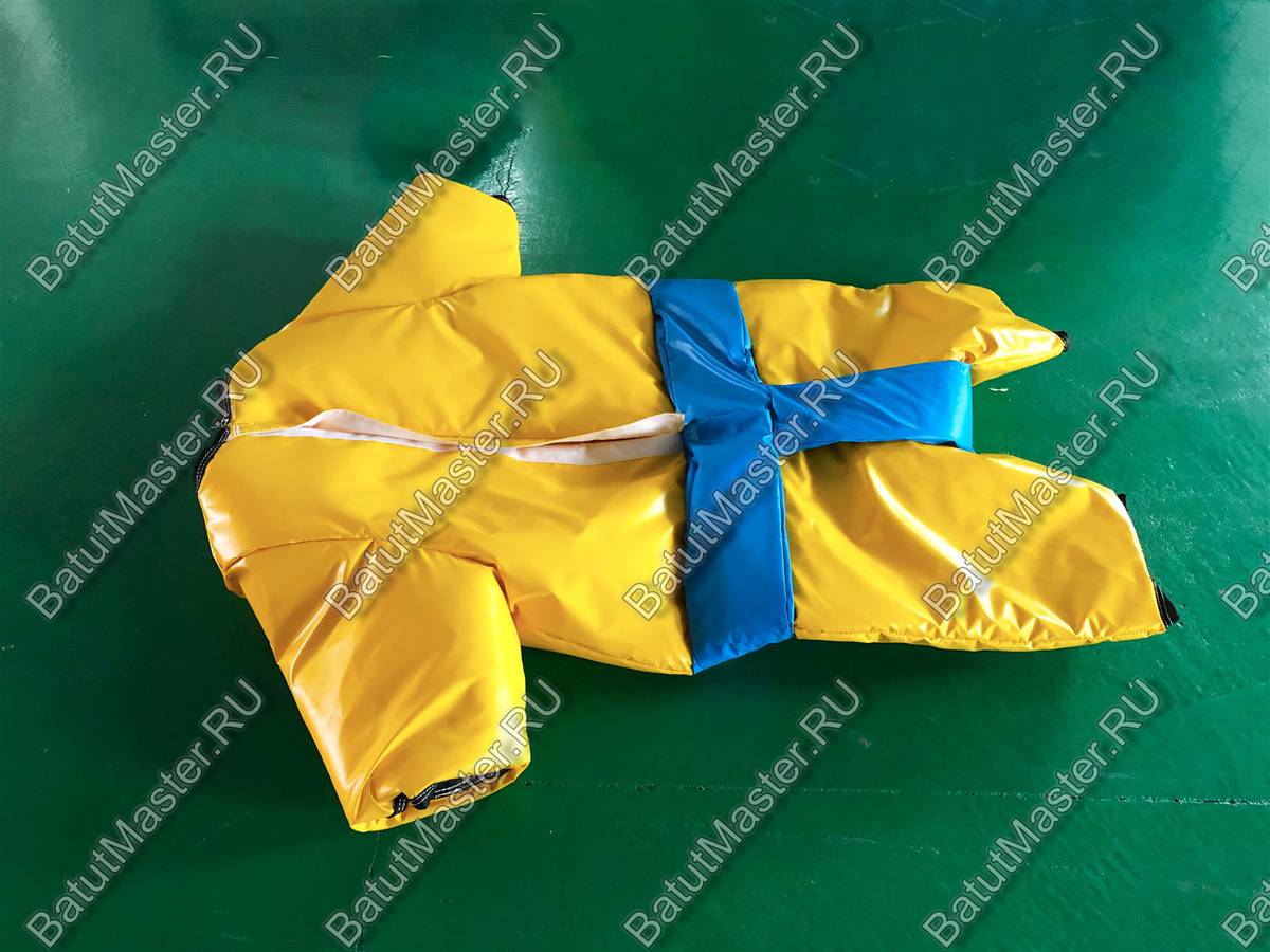 В комплект входит ярко-жёлтая форма с голубым поясом и с голубыми перчатками и шлемы. Такая яркая расцветка настраивает на что-то хорошее и позитивное. На таком боксе не придётся биться до потери сознания. Это будет безобидное соревнование, где можно снять стресс.