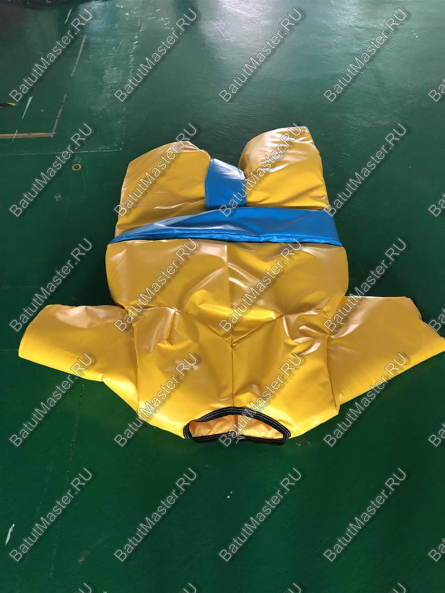 Человек одетый в костюм не получает никаких повреждений, даже если бой ведется серьезно. Цвет защитного снаряжения ярко-желтый с синим поясом, расположенным в паховой области в качестве дополнительной защиты. В комплект также входят две пары голубых перчаток, два шлема оранжевого и синего цветов.