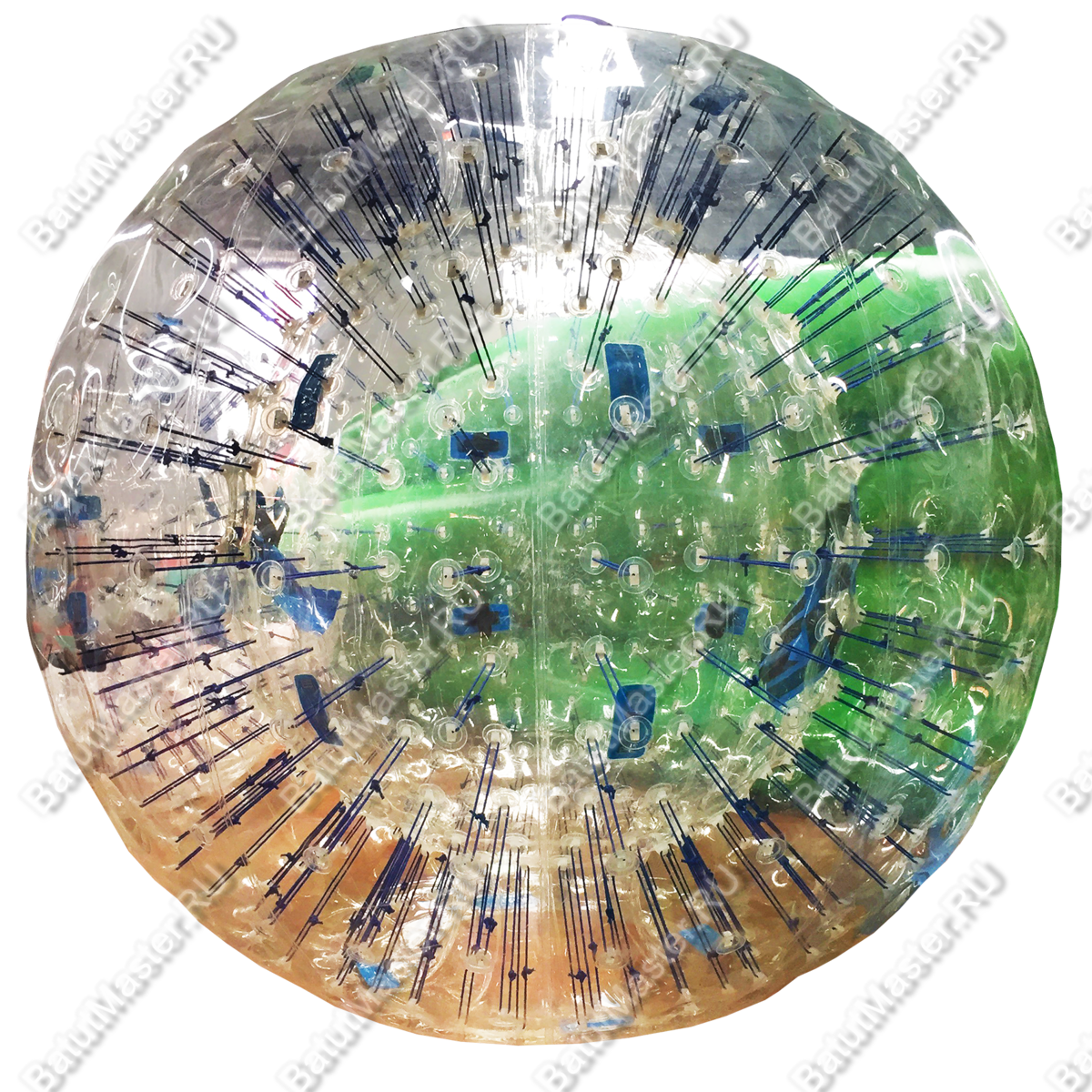 Зорб изготовлен из плотного материала. Украшен он цветными стропами, которые не позволяют шару выглядеть скучно.