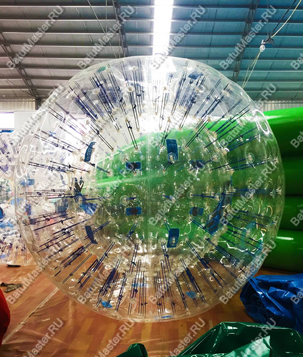 Надувные зорбы вошли в развлекательный бизнес, как универсальные аттракционы, которые можно использовать на любой поверхности: вода, трава или снег. Именно поэтому зорбинг не имеет конкретного сезона проката и готов приносить вам прибыль в любой день года. Представленный зорб впечатляющих размеров достигает 2,8 м в своем диаметре. Внутри зорба оборудовано 2 места для пассажиров с ростом от 120 до 180 см. Внутренняя и внешняя оболочка из ПВХ связаны между собой ярко синими стропами, но цвет этих строп вы можете изменять по своему желанию: заказать разноцветные стропы, стропы другого цвета или даже светящиеся. Также модификация зорба может проходить и по другим параметрам (размер, количество сидений, количество входов и др.).