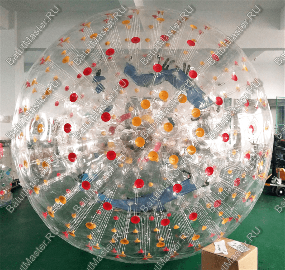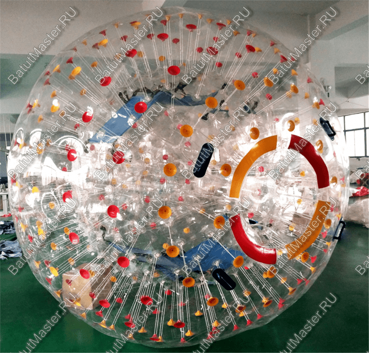 Красочный зорб «Улей» имеет прозрачную основу с яркими красными и темно желтыми пятнами по всей поверхности, они расположены равномерно и чередуются рядами. Соединительные стропы прозрачные, поэтому они почти не заметны, со стороны кажется, что внешняя поверхность просто немного втянута внутрь в местах соединения. Вход во внутреннюю сферу обозначен яркими накладками красного и желтого цвета с черными накладными ручками сверху.