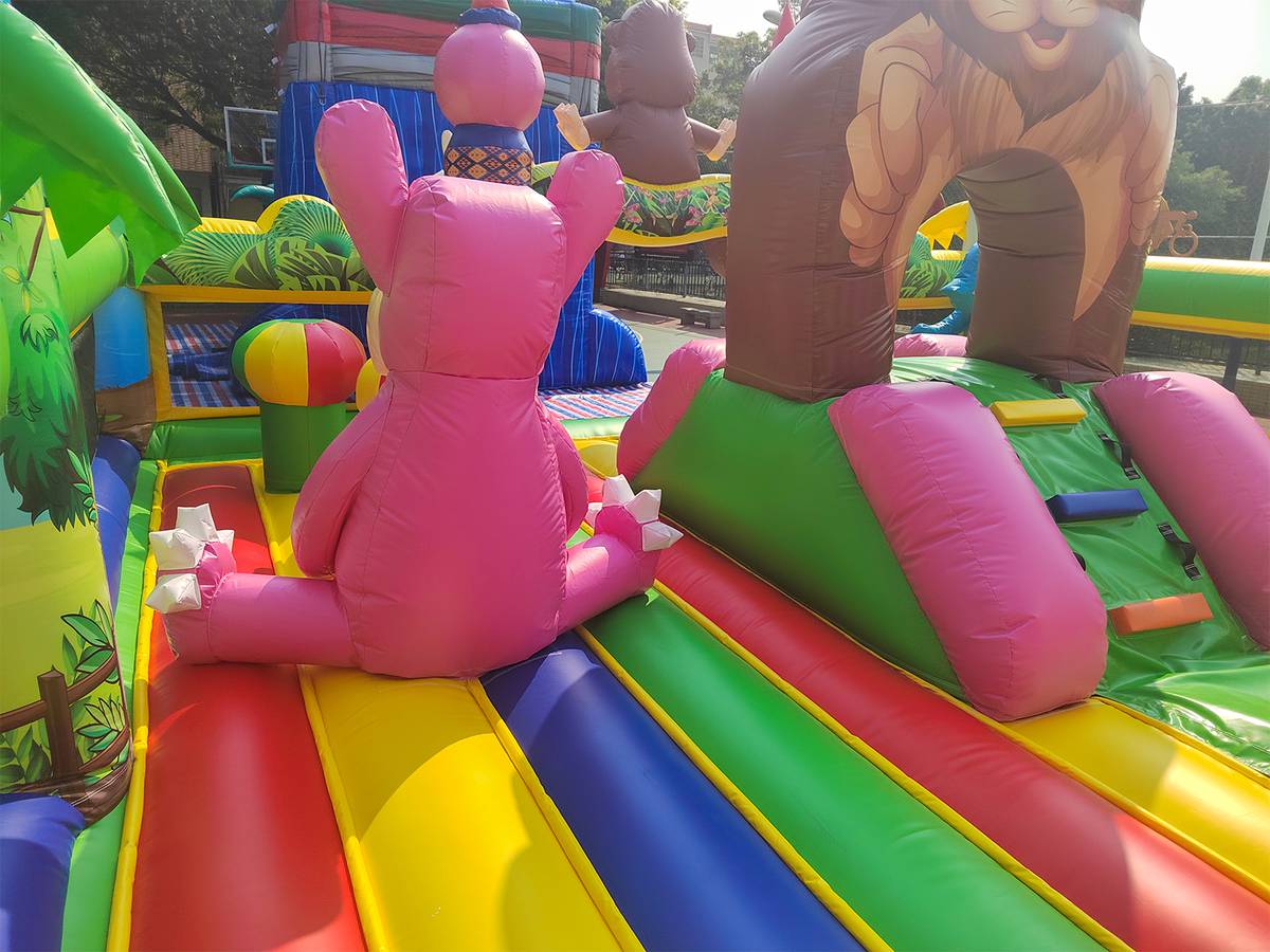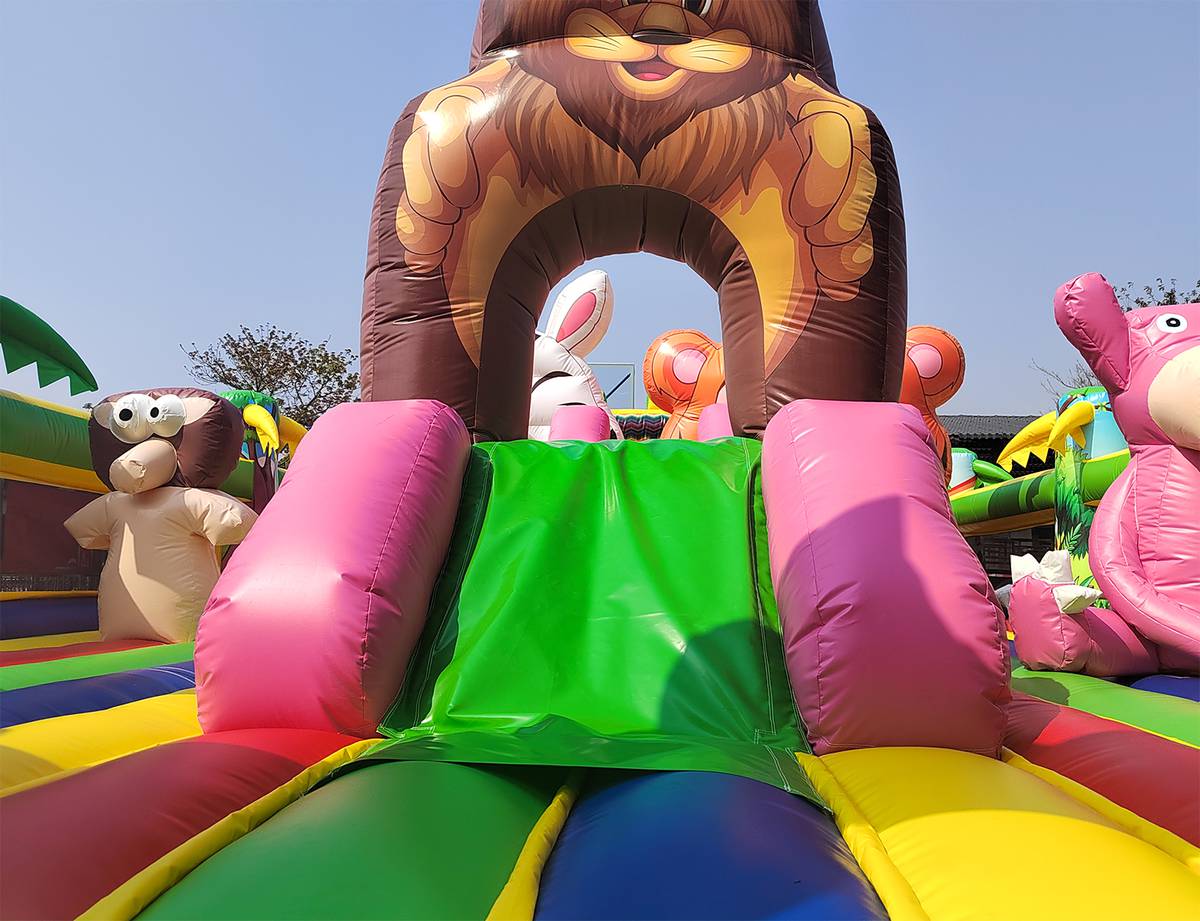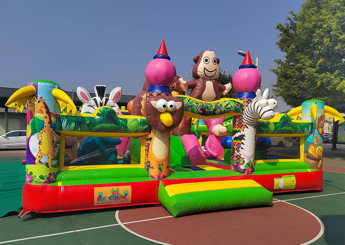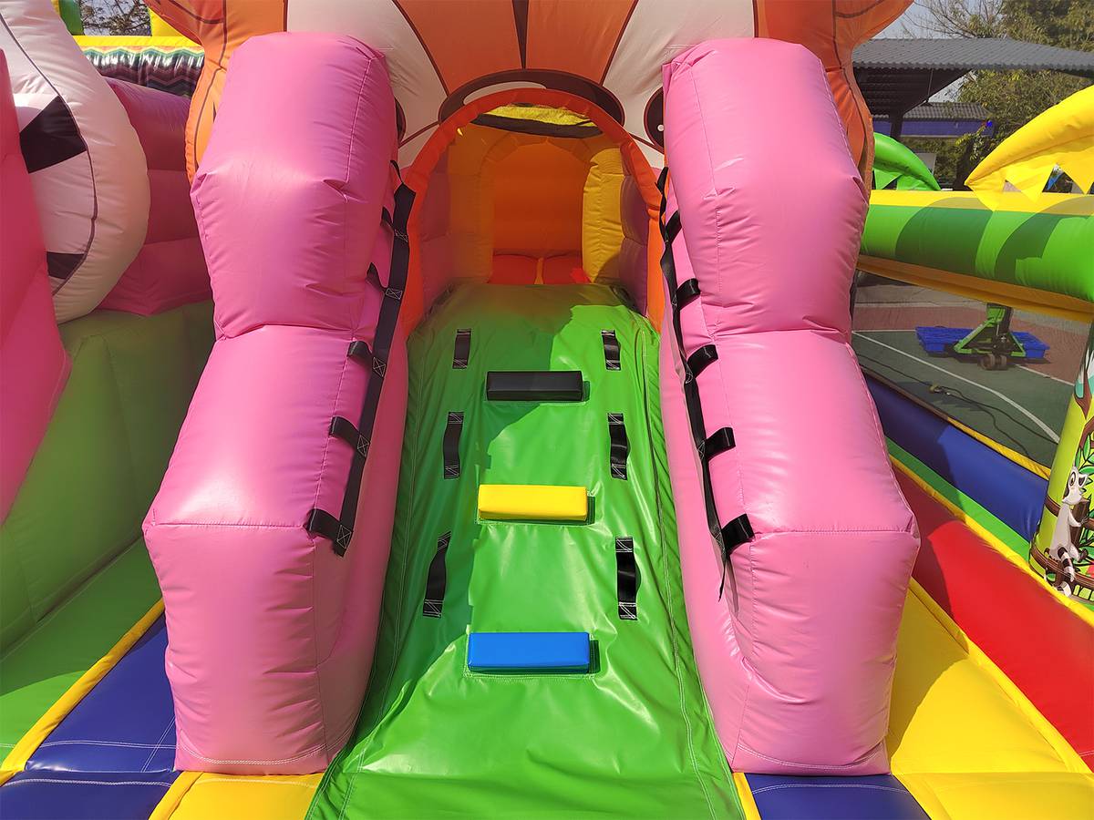 Внутри батута ребёнка ожидает огромный выбор развлечений. Тут есть множество игровых фигур в виде животных, с которыми можно поиграть, различные арки в виде звериных мордашек, а также подъёмы с лестницами и маленькими горками.