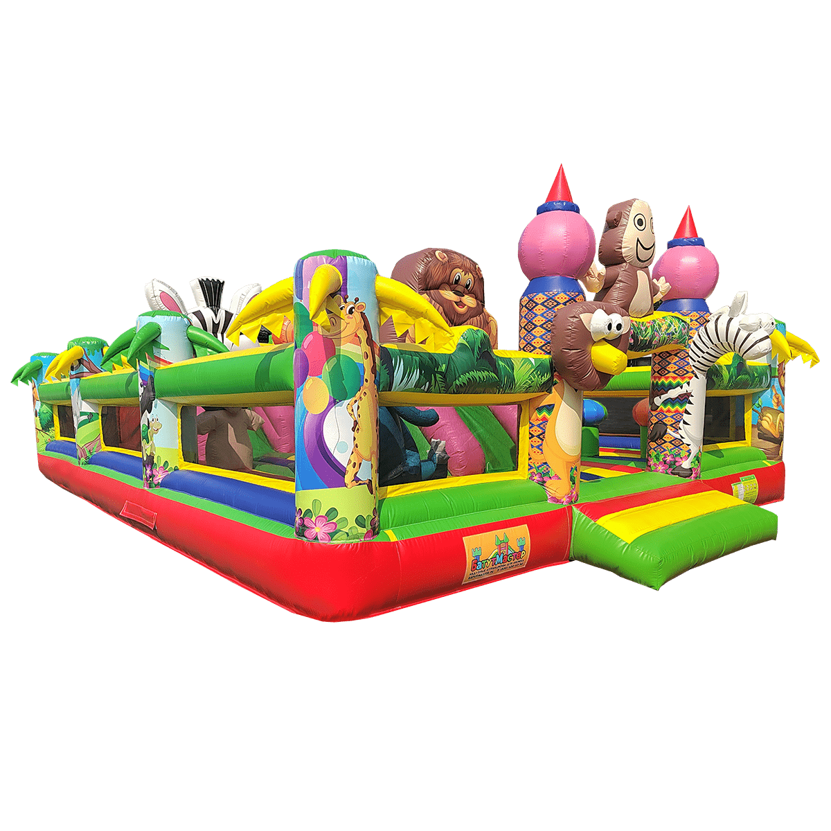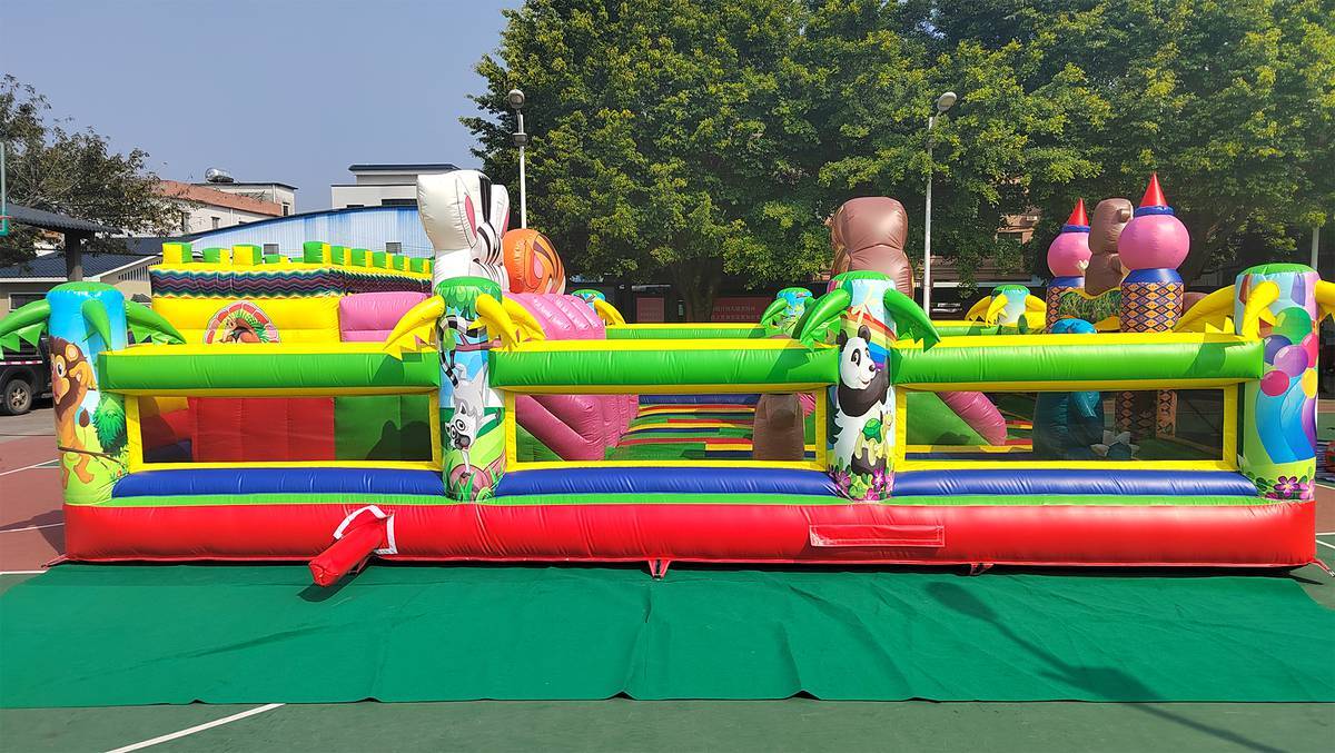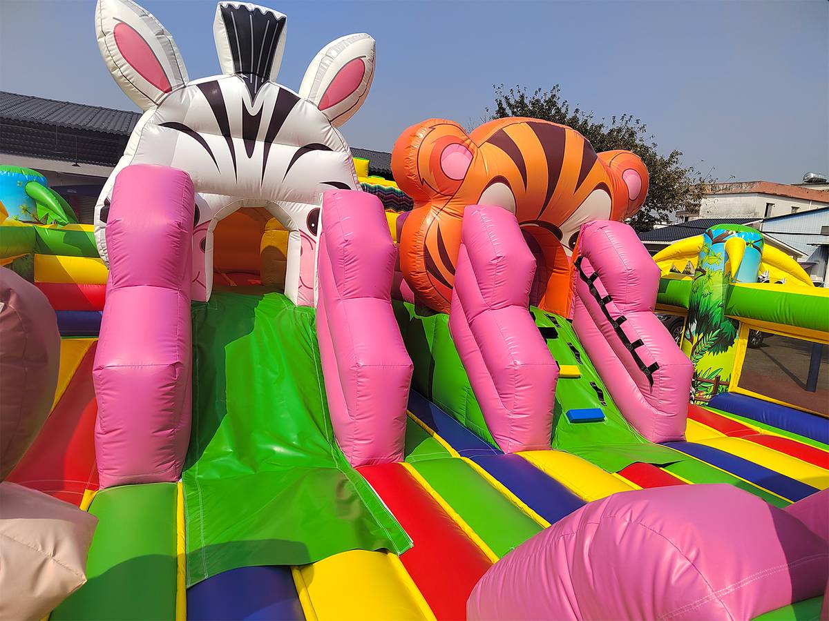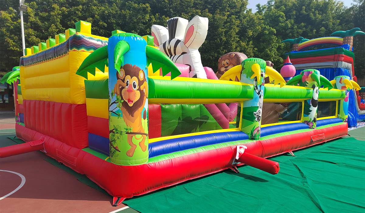 Внутри батута ребёнка ожидает огромный выбор развлечений. Тут есть множество игровых фигур в виде животных, с которыми можно поиграть, различные арки в виде звериных мордашек, а также подъёмы с лестницами и маленькими горками.
